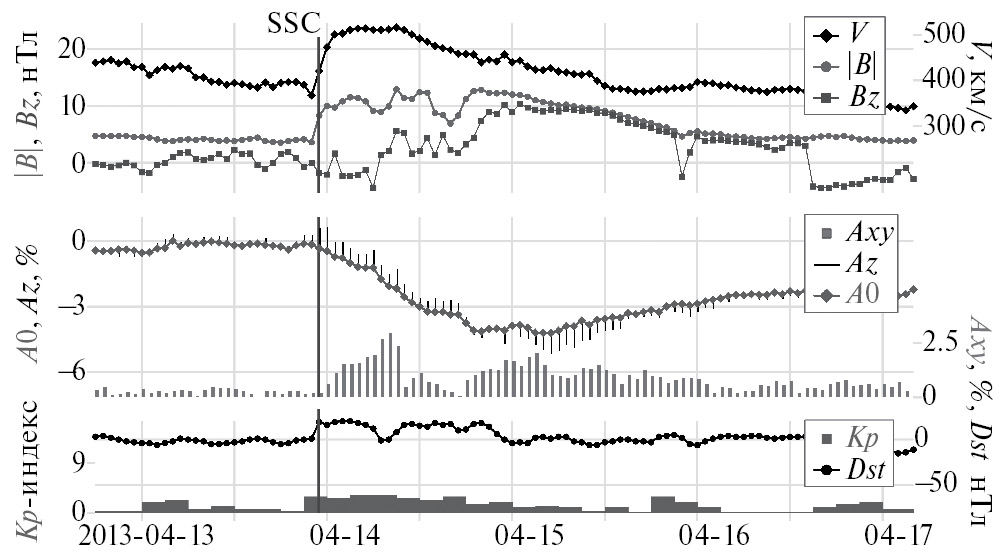 6. Рис. 5. Событие 13–16 апреля 2013 г., в котором не зарегистрирована ГМБ, но наблюдался большой ФЭ (4.4%).
