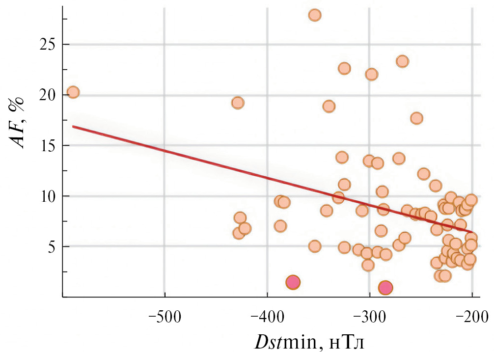 8. Рис. 7. Связь минимальных величин Dst-индекса ГА (Dstmin) и амплитуды ФЭ (AF) с параметром VmBm.