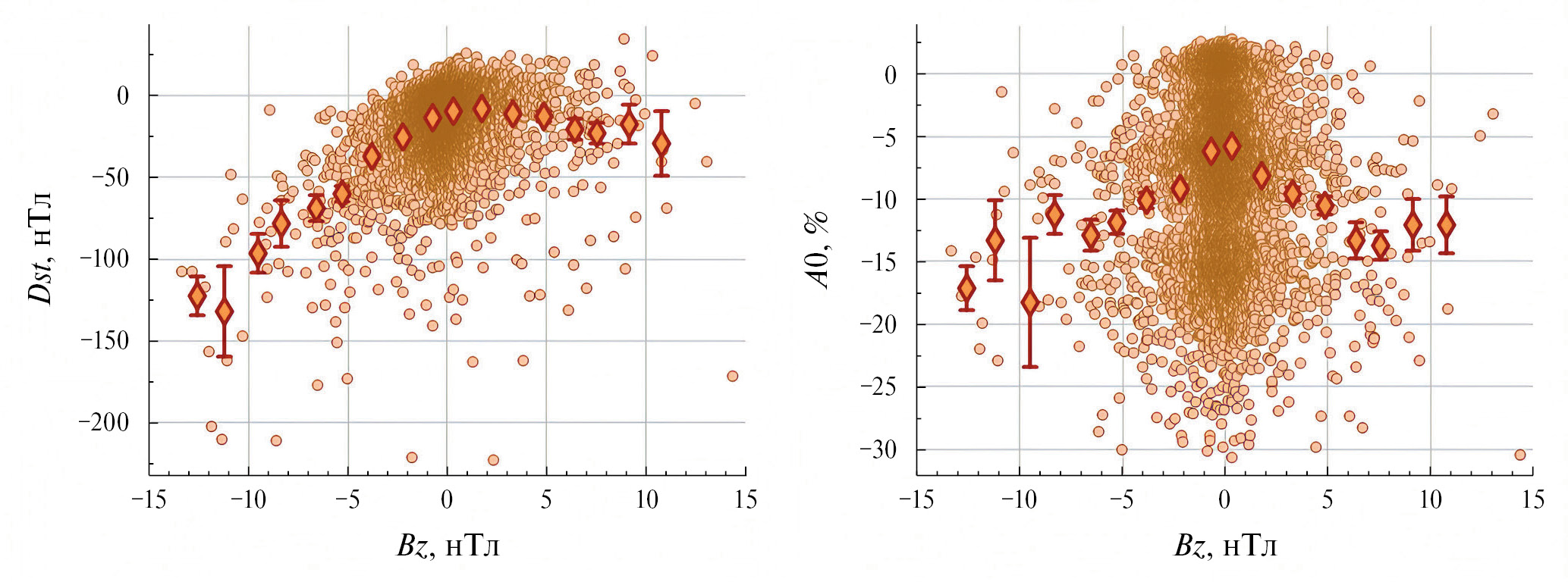 9. Рис. 8. Связь среднесуточных значений Dst-индекса ГА и плотности потока КЛ (А0) с Bz-составляющей ММП (ромбами показаны величины, усредненные по равным интервалам изменения значений Bz).
