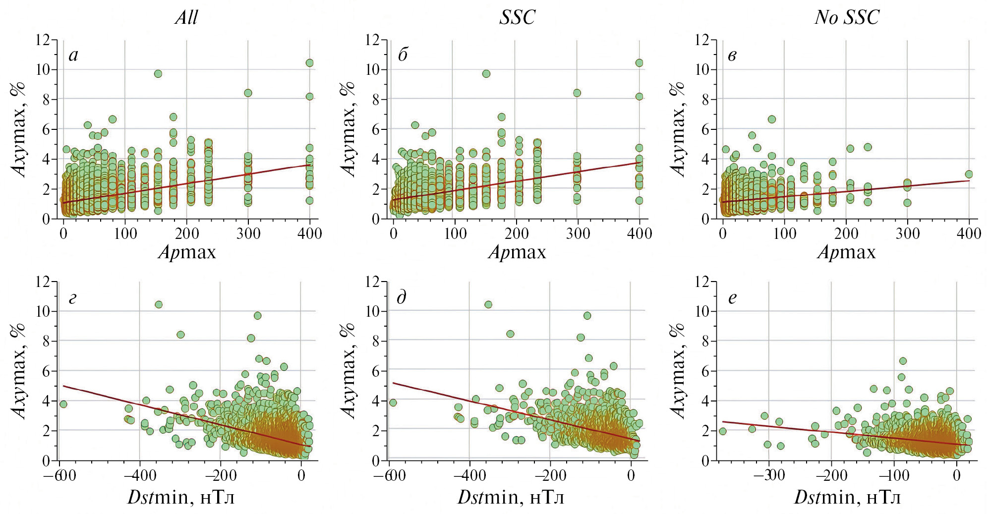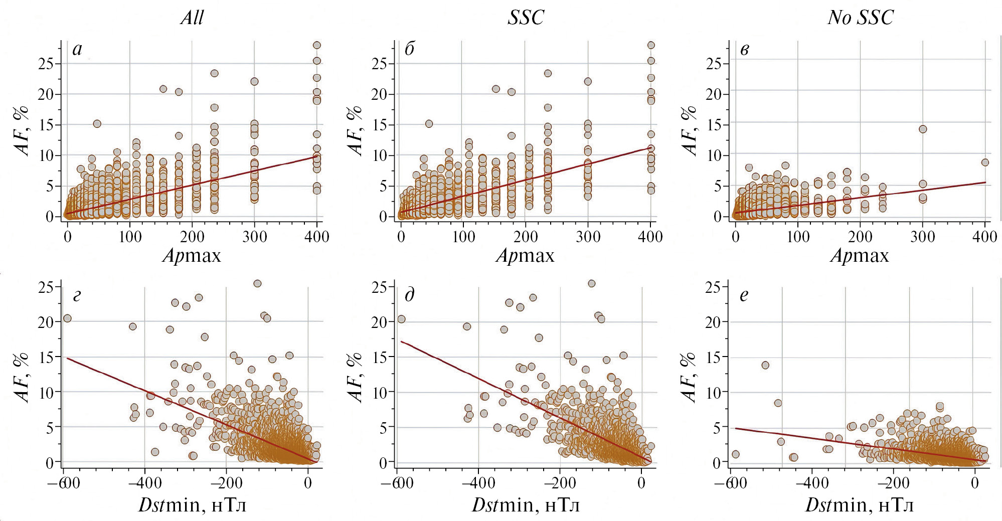 На рис. 11 и рис. 12 видим похожую на рис. 9 ситуацию, так как анизотропия КЛ сильно связана с изменениями изотропной части потока КЛ и амплитудой ФЭ. Отметим, что на рис. 9д, 10д, 11д, 12д сильно выпадает точка со значением Dstmin = –589 нТл – это знаменитое Квебекское событие, отключившее электростанции на севере Канады на 9 часов и показавшее полярное сияние жителям Мексики. Тогда была зарегистрирована экстремальная магнитная буря, третья по величине за время современных наблюдений с 1932 г. Амплитуда ФЭ в этом событии также получилась очень большой AF = 20%, но не рекордной.