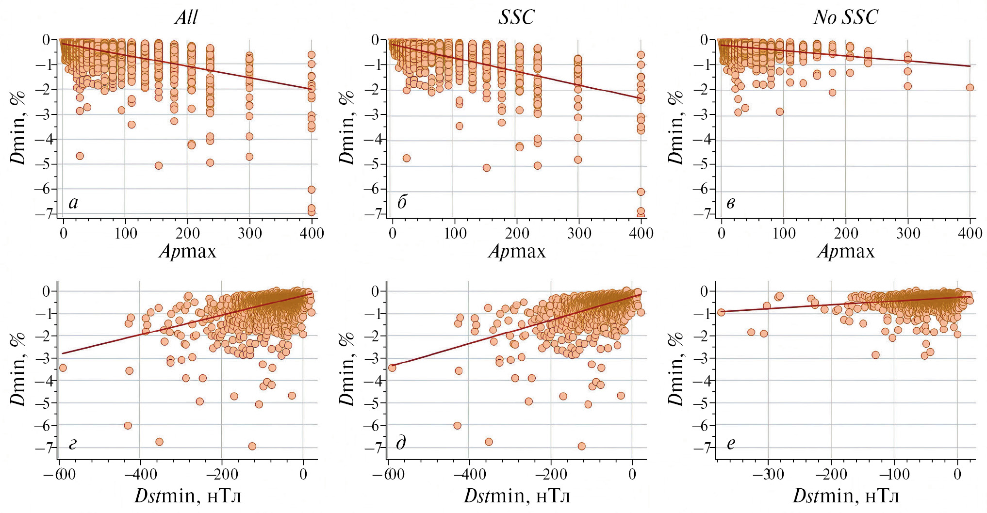 11. Рис. 10. Взаимосвязь величины максимального часового понижения плотности КЛ (Dmin) с индексами ГА (Apmax, Dstmin) для выделенных групп.