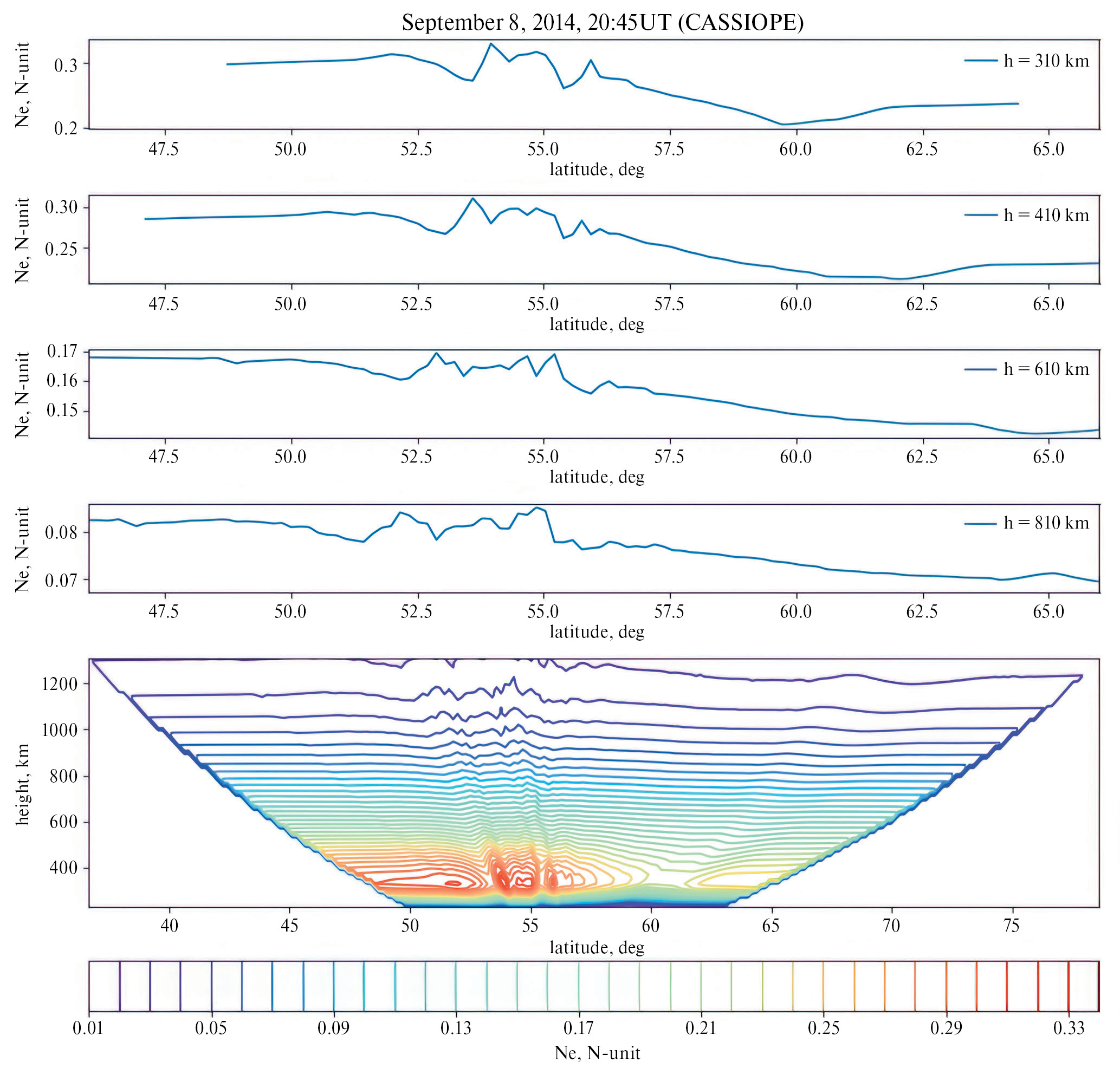 Рис. 2. Радиотомограмма, полученная 09.09.2014 г. в 00:45 мск. На четырех верхних панелях приведены профили концентрации электронов на высотах 310, 410, 610 и 810 км (сверху вниз).
