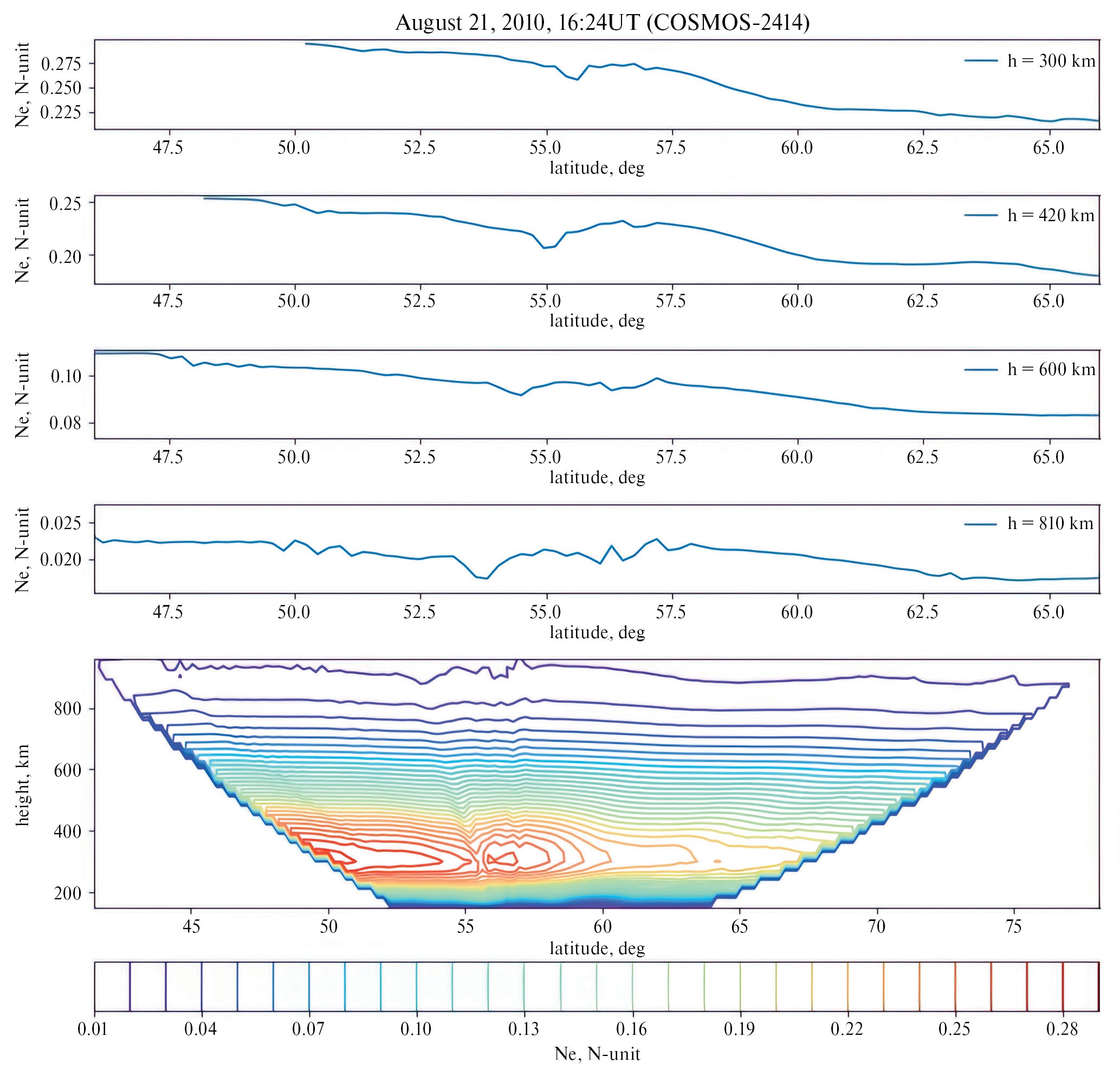 Рис. 1. Радиотомограмма, полученная 18.08.2011 г. в 22:48 мск (внизу). На четырех верхних панелях приведены профили концентрации электронов на высотах 300, 400, 600 и 800 км (сверху вниз).