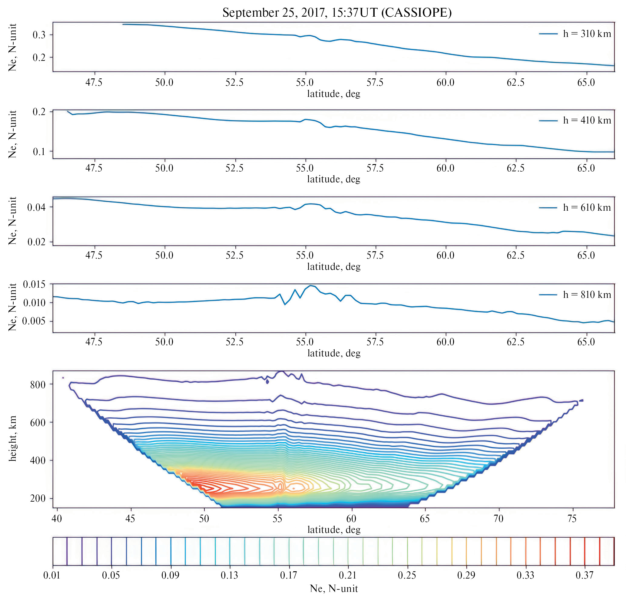 Рис. 4. Радиотомограмма, полученная 25.09.2017 г. в 18:37 мск. На четырех верхних панелях приведены профили концентрации электронов на высотах 310, 410, 610 и 810 км (сверху вниз).
