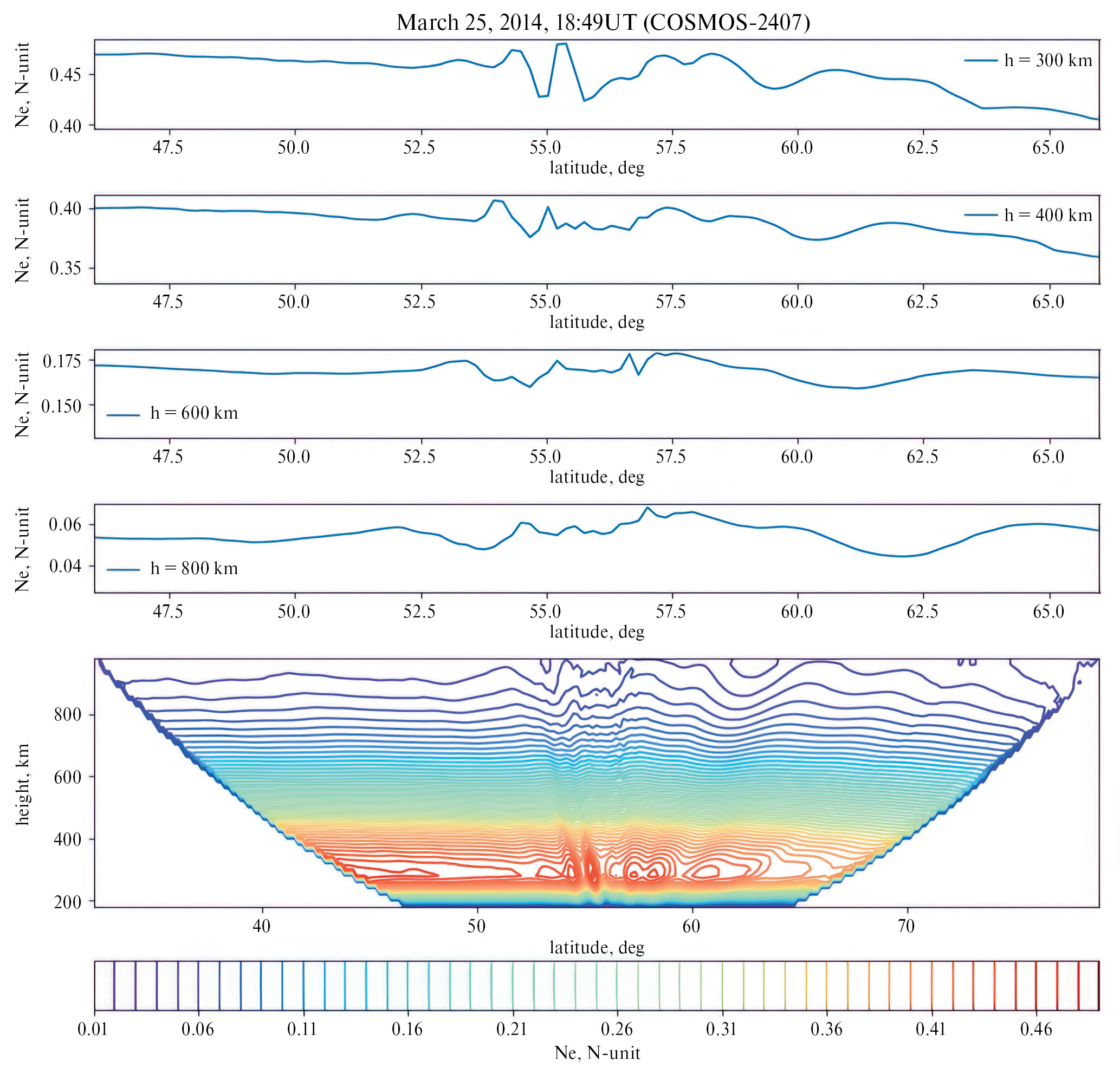 Рис. 5. Радиотомограмма, полученная 25.03.2014 г. в 22:49 мск. На четырех верхних панелях приведены профили концентрации электронов на высотах 300, 400, 600 и 800 км (сверху вниз).