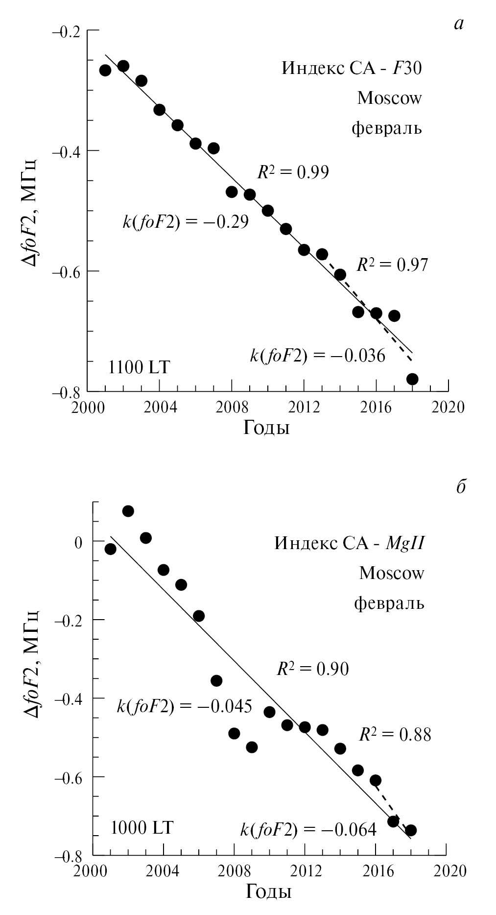 Необходимо сделать следующее пояснение. Не следует удивлятьcя тому, что поведение точек относительно аппроксимирующей линии при заданном месяце может быть различным для одной станции, но для различных часов LT. Приводимые в банках величины медиан foF2 содержат неизбежные ошибки (мы писали об этом и приводили примеры в работе [Данилов и Константинова, 2013]). Кроме того, они могут отражать наличие в данном месяце дней с магнитными возмущениями, нарушая тем самым зависимость от времени, которую мы анализируем. Все это и приводит к разбросу (иногда достаточно сильному) точек относительно аппроксимации. На наш взгляд, важным является статистическая сторона вопроса – во всех проанализированных ситуациях (станция, месяц, индекс СА, момент LT) наблюдается уменьшение ΔfoF2 со временем, дающее отрицательный тренд foF2.