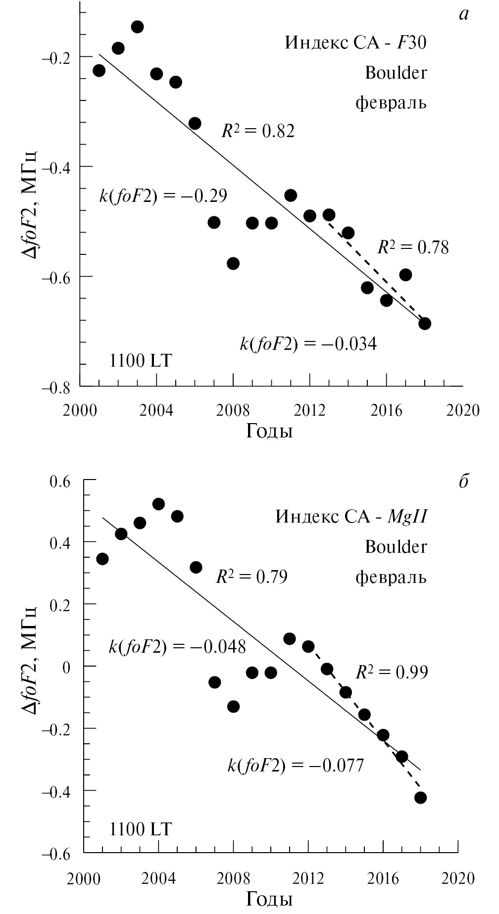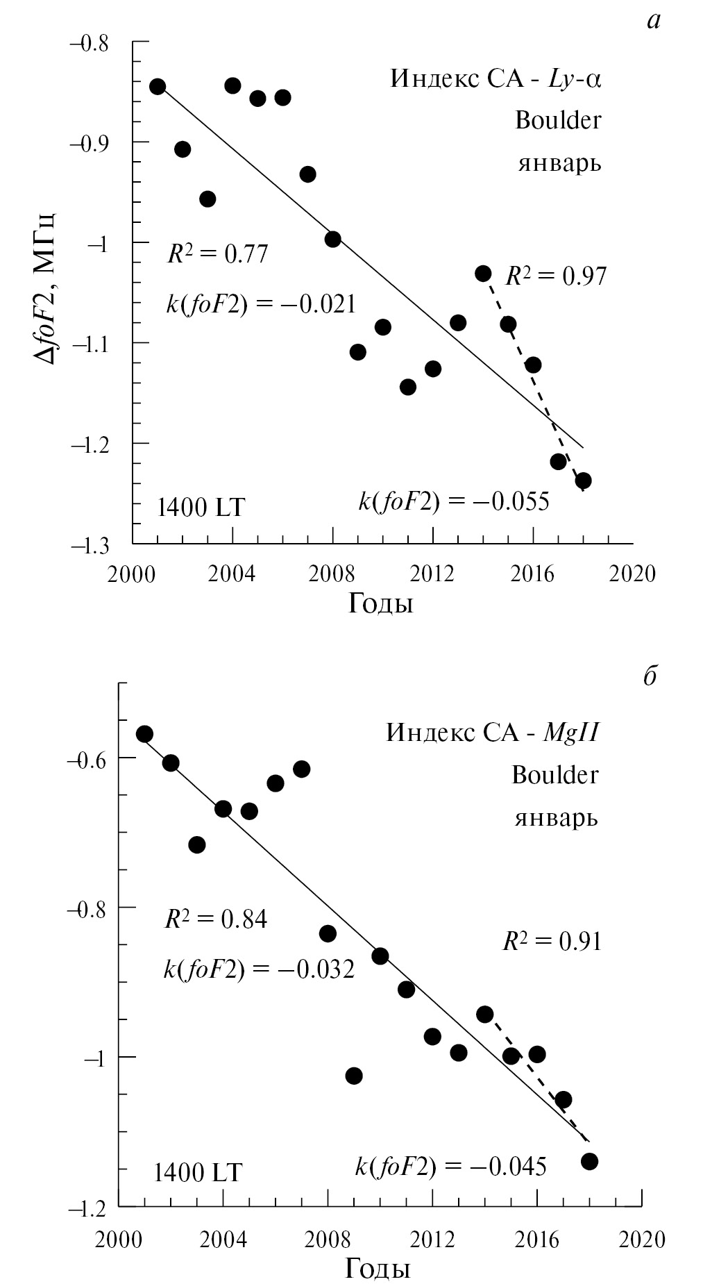 Видно также, что средние околополуденные величины k(foF2) достаточно близки для всех трех индексов СА. Например, для ст. Moscow в феврале, когда не обнаружено указанных проблем с трендами при использовании индекса Ly–α, величины k(foF2) составляют –0.027, –0.030 и –0.042 МГц/год при SD в пределах 0.003–0.006 МГц/год. Для ст. Boulder проблем с трендами при использовании Ly–α не обнаружено – и в январе, и в феврале тренды, получаемые с помощью всех трех индексов СА, близки между собой.