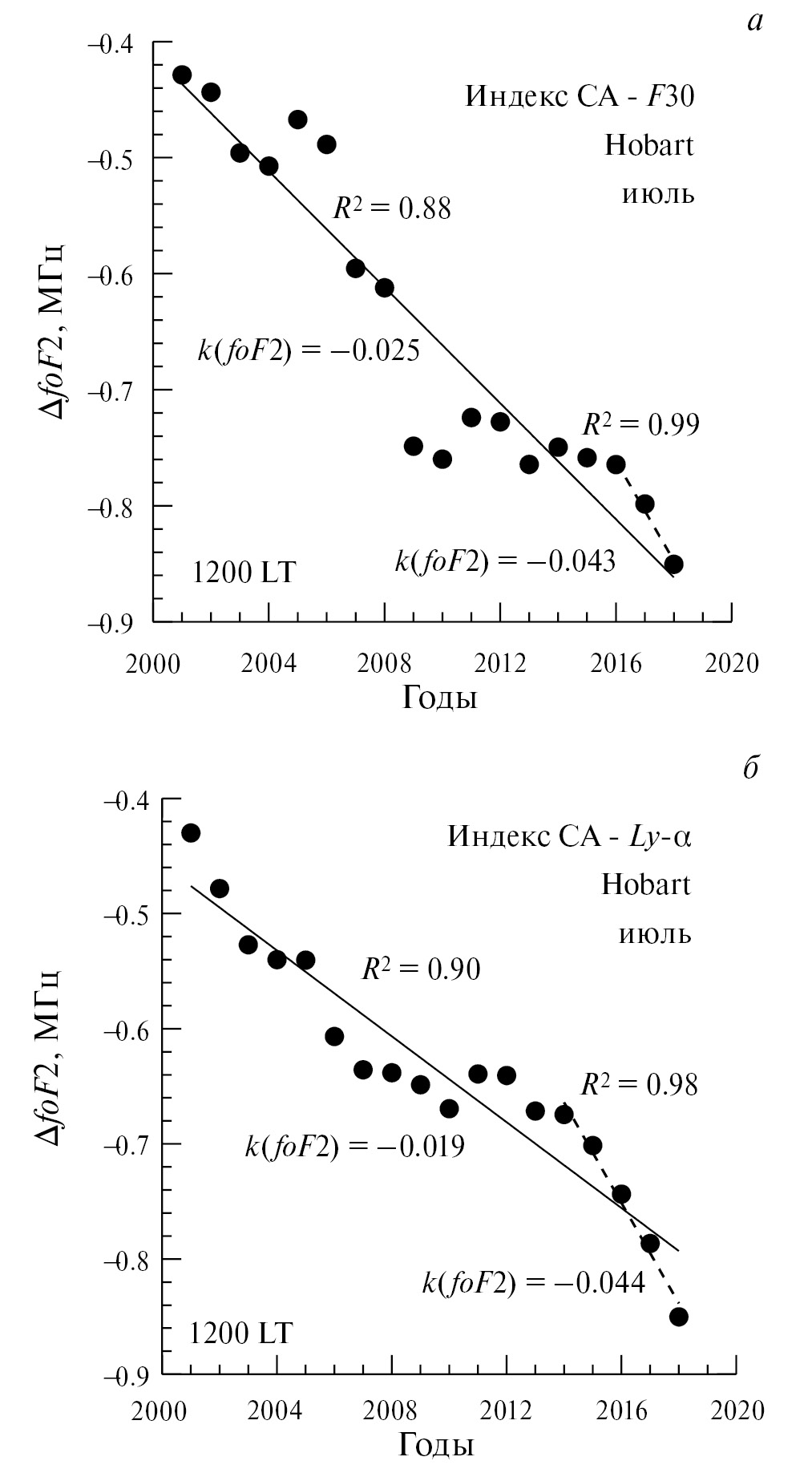 При определении трендов ионосферных параметров очень важен вопрос о выборе индексов солнечной активности (СА) для устранения эффектов СА. Вопрос обсуждался многими исследователями. Отметим здесь лишь две работы аргентинской группы [De Haro Barbás and Elias, 2020; De Haro Barbás et al., 2021] и публикации Laštovička [2022] и Laštovička and Burešová [2023].