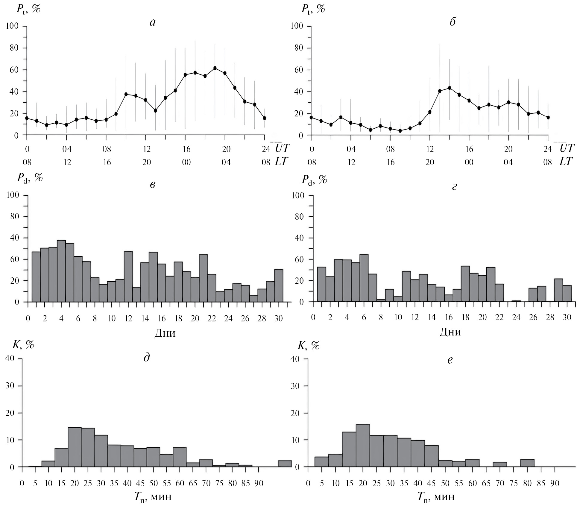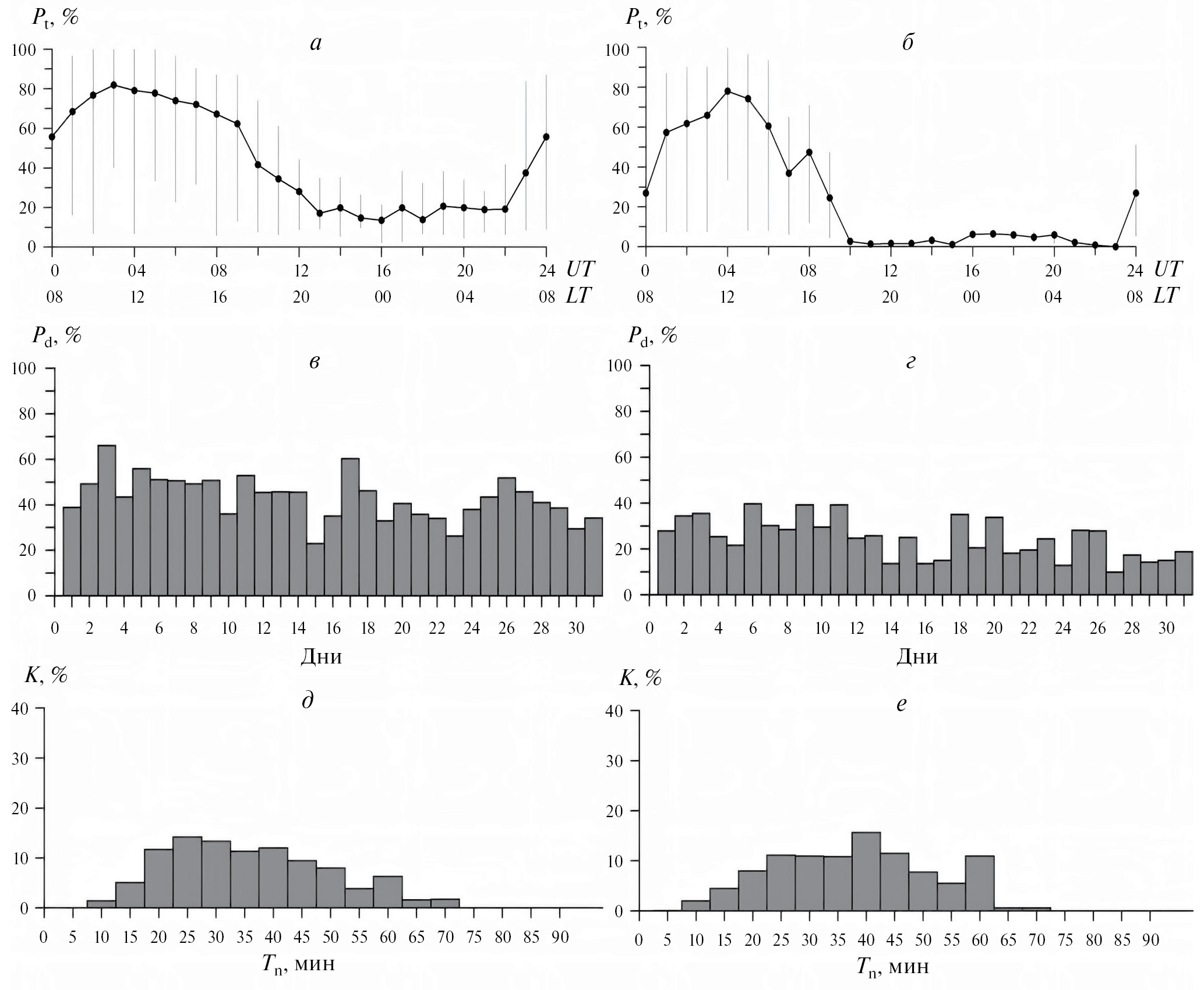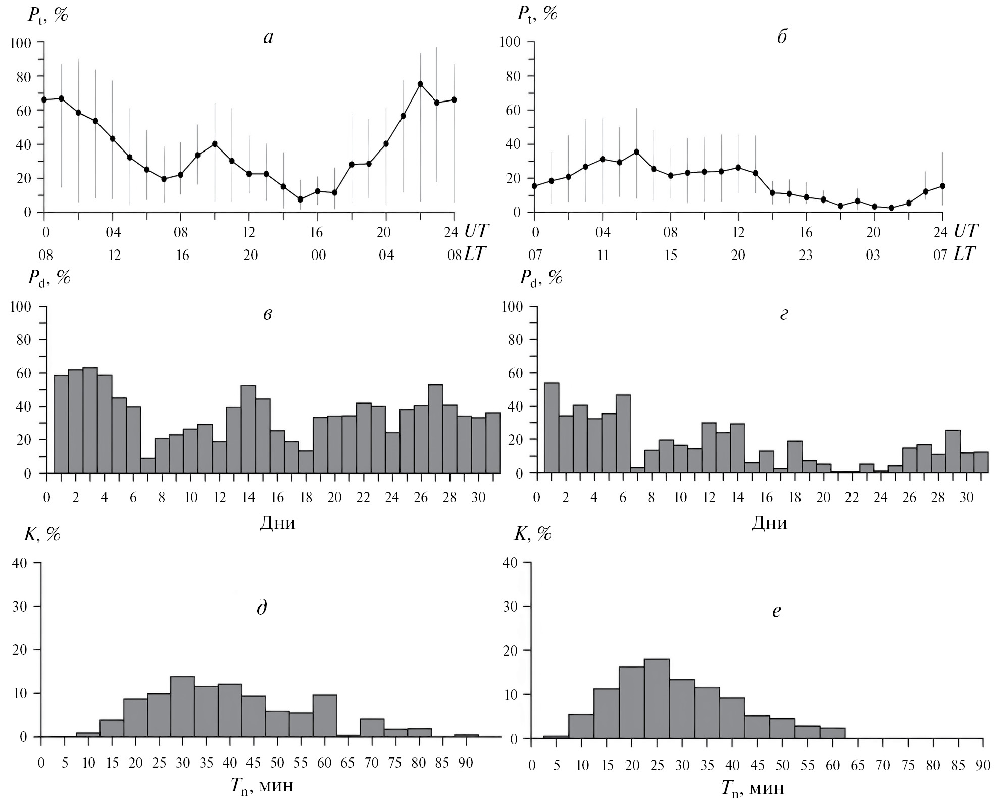 Для весеннего сезона характерно существенное падение вероятности регистрации СМ ПИВ (Pt) на трассах Хабаровск−Иркутск (рис. 4а) и Магадан−Иркутск в дневные часы местного времени и увеличение ее в утренние и вечерние часы. При этом среднесуточная вероятность регистрации СМ ПИВ (Pd) уменьшилась незначительно за счет расширения временного интервала регистрации СМ ПИВ. Незначительно изменились и гистограммы распределения времени регистрации отдельных СМ ПИВ (Tn) для этих радиотрасс.