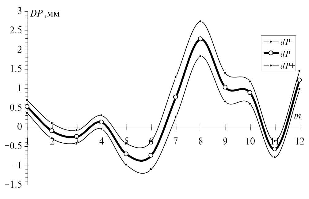 Зависимость средней величины DP от номера месяца года m для всех 456 рассмотренных метеорологических станций России изображена на рис. 4. На этом графике наглядно показана очень малая погрешность вычислений величины DP, что является следствием выбора большого количества метеорологических станций в сравнительно небольшом диапазоне широт.
