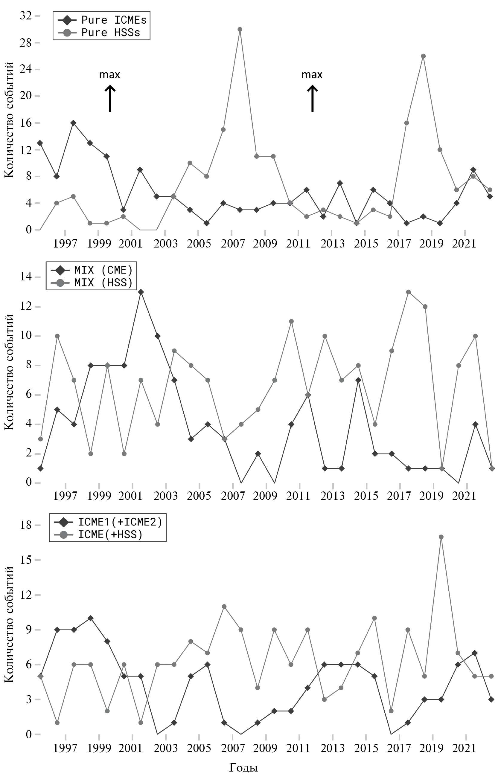 Интересно отметить, что количество событий в различных группах подвержено зависимости от фазы цикла солнечной активности. На рис. 2 представлено изменение количества событий в различных группах за весь исследуемый период времени (верхняя панель – группы изолированных событий, средняя панель – группы MIX, нижняя панель – группы, включающие пары взаимодействующих событий). Вертикальными стрелками (max) на верхней панели отмечены годы максимумов солнечной активности.