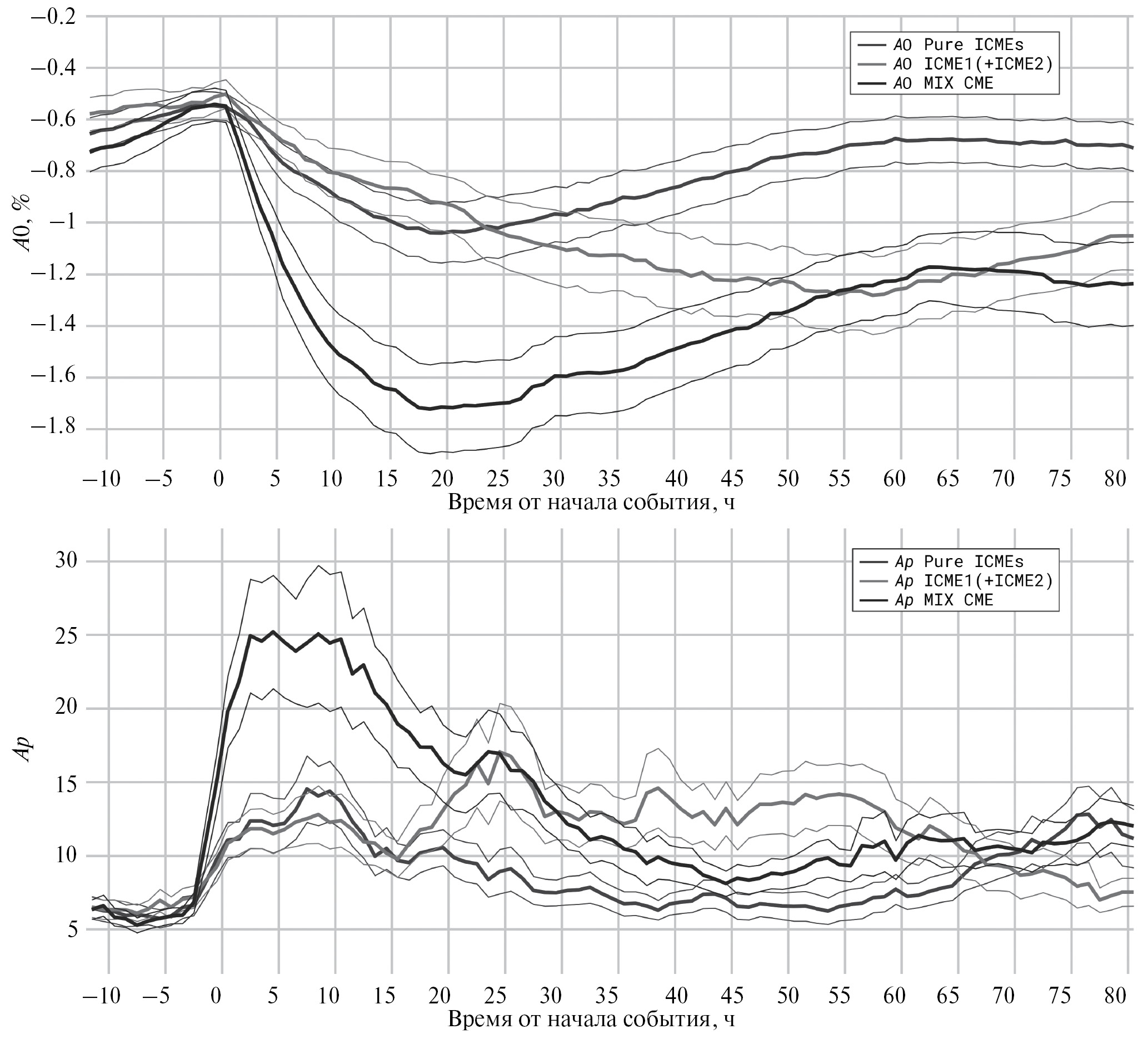 Самые большие значения Ap-индекса (нижняя панель) регистрируются в группе MIX CME, и максимум приходится на первые часы от начала события, значения которого соответствуют возмущенной геомагнитной обстановке, хотя следует учитывать, что метод наложения эпох сглаживает и занижает значения. В группе следующих друг за другом КВМ значения Ap-индекса сравнимы с группой “чистых” КВМ в течение первых суток. Затем в группе ICME1+ICME2 Ap-индекс остается повышенным (от 10 до 15) еще на протяжении почти двух суток, что соответствует слабовозмущенной геомагнитной обстановке. Это свидетельствует о большей геоэффективности парных событий в отношении длительности геомагнитных возмущений.