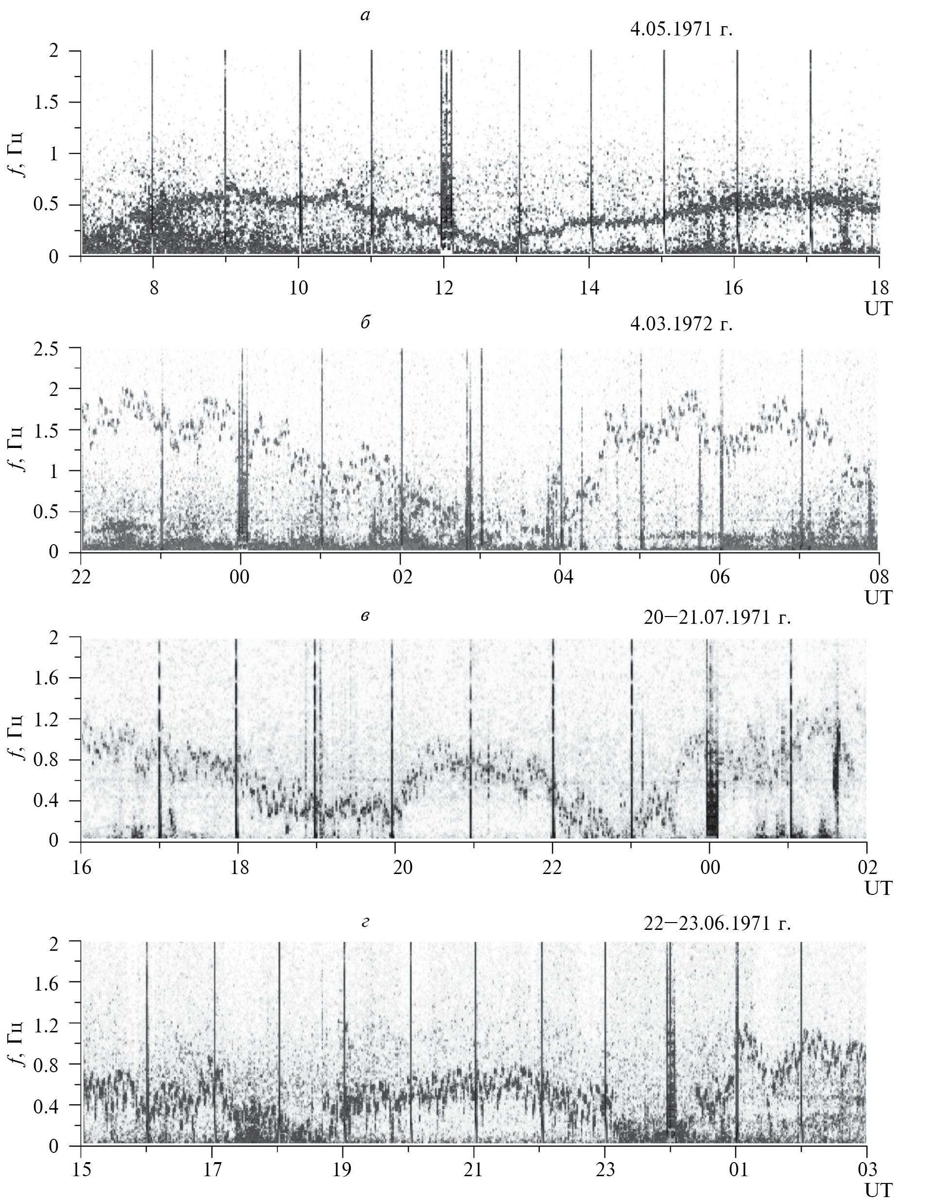 3.1. На рис. 1а, б приведены типичные фрагменты вариации серпентинной эмиссии в обс. Восток, центральная несущая частота f которых постепенно уменьшалась в течение нескольких часов до минимального значения fmin и затем возвращалась к первоначальному уровню. Например, 1.05.1971 г. и 4.03.1972 г. fmin наблюдалась в интервалах времени 12:00–13:00 UT и 03:00–04:00 UT соответственно при постепенном снижении несущей частоты SE. Иногда в течение суток последовательно отмечались 2 и более эпизодов понижения несущей частоты (рис. 1в, г). Так, 20.07.1971 г. несущая частота SE снижалась до минимума в 19:00–20:00 UT и в 22:00–23:00 UT, а 22.06.1971 г. в 18:00–19:00 UT и 23:00–24:00 UT и затем увеличивалась до первоначального уровня. Характерно, что этот эффект наблюдался независимо от существующего периода модуляции несущей частоты в режиме SE. Центральная несущая частота эмиссии как с 5-минутной модуляцией, так и с более длиннопериодной модуляцией плавно уменьшалась в несколько раз (иногда ~ от 1–1.5 Гц до 0.1–0.2 Гц) и затем увеличивалась в течение 2–3 ч до первоначального уровня.
