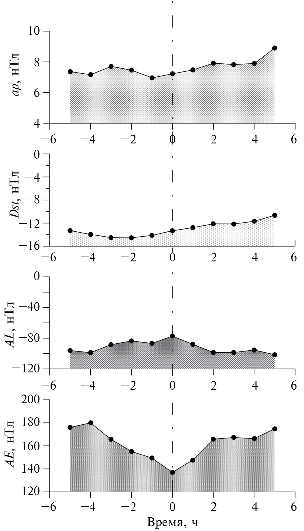 Рис. 4. Динамика средних значений индексов геомагнитной активности, полученная методом наложения эпох для случаев наблюдения понижения и последующего возрастания несущей частоты серпентинной эмиссии в обс. Восток. Нулевая точка на горизонтальной оси соответствует часу, в котором несущая частоты достигала наименьшего значения fmin.