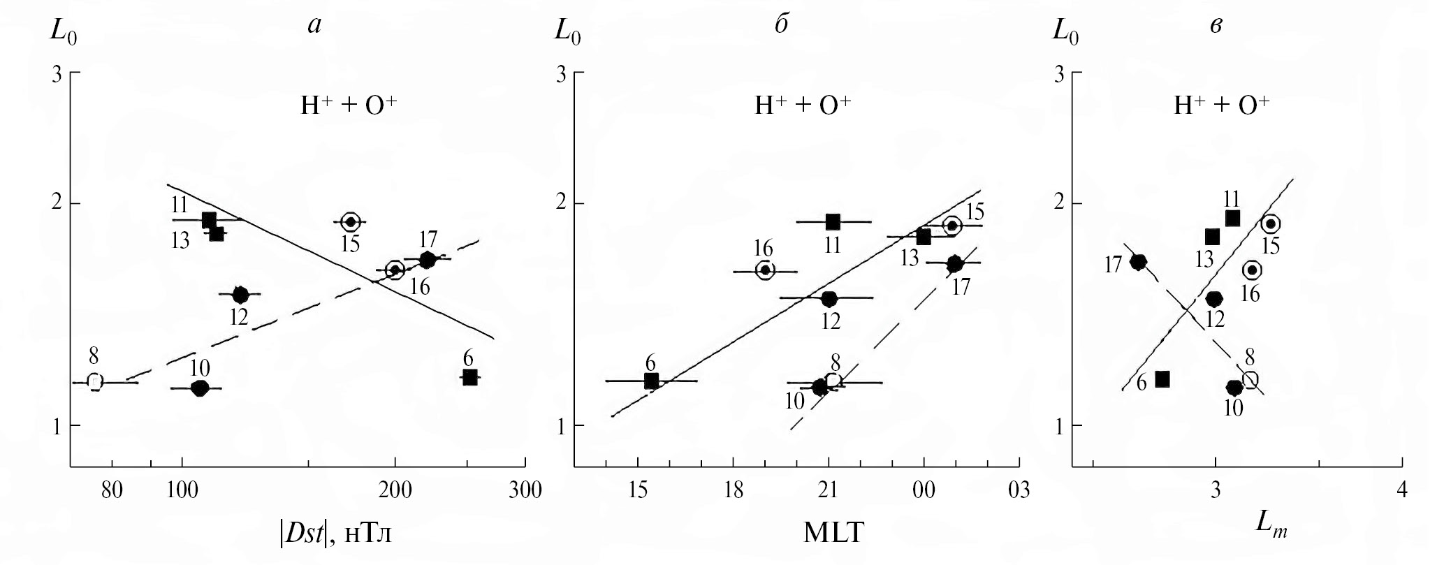 Из рис. 5a и 5в видно, что для суммы ионов H++O+ c E ~ 1–300 кэВ чем больше |Dst| и меньше параметр Lm в конце главной фазы бурь, тем меньше параметр L0. Эти результаты могут свидетельствовать о том, что для более сильных бурь внешние магнитные трубки геомагнитной ловушки в вечернем и околополуночном секторах сильнее вытягиваются в сторону хвоста магнитосферы; при этом внешняя граница ловушки приближается к Земле.