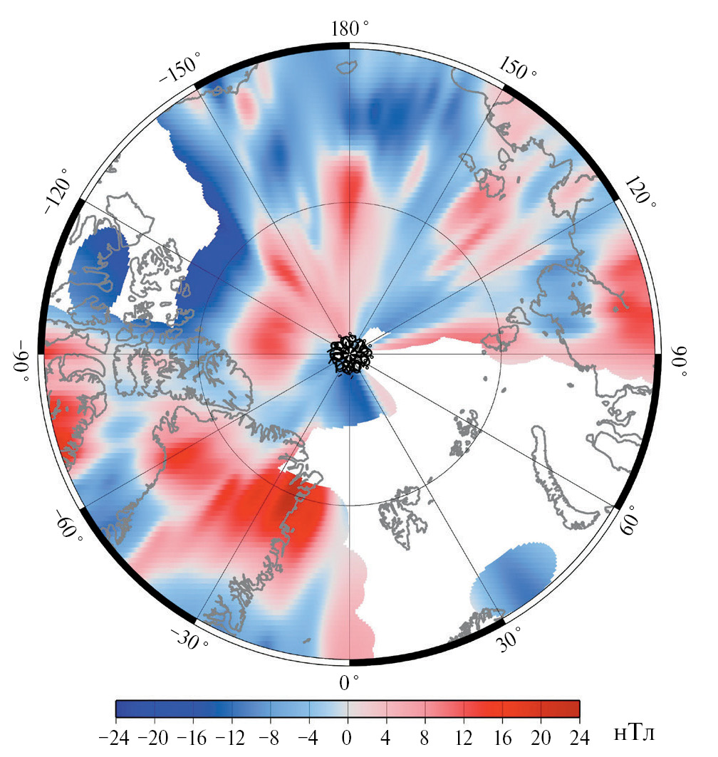 Рис. 1. Пространственное распределение поля ЛМА (литосферного аномального магнитного поля Ta) над Полярной Арктикой на уровне орбиты спутника ~260‒280 км.