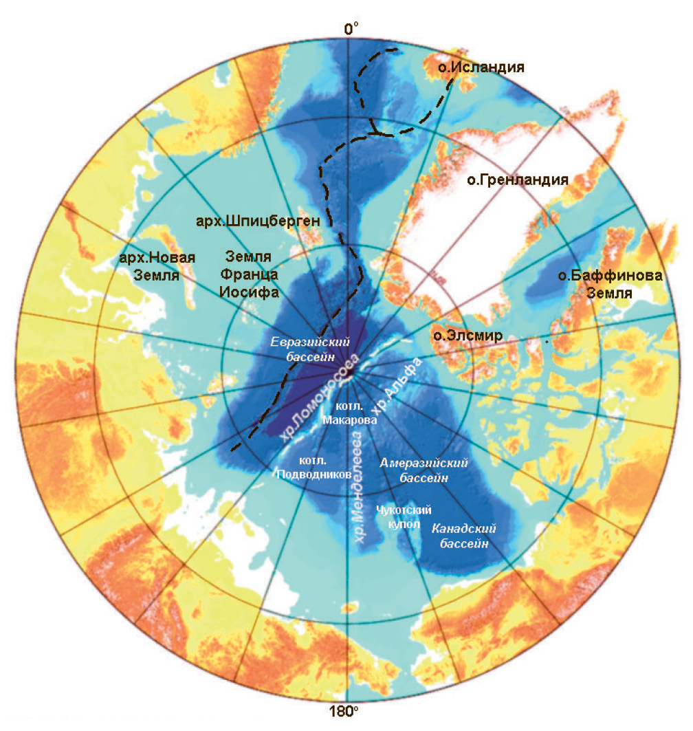 Рис. 2. Арктический регион: основные тектонические/географические элементы, пунктирной линией обозначено положение срединно-океанических хребтов.