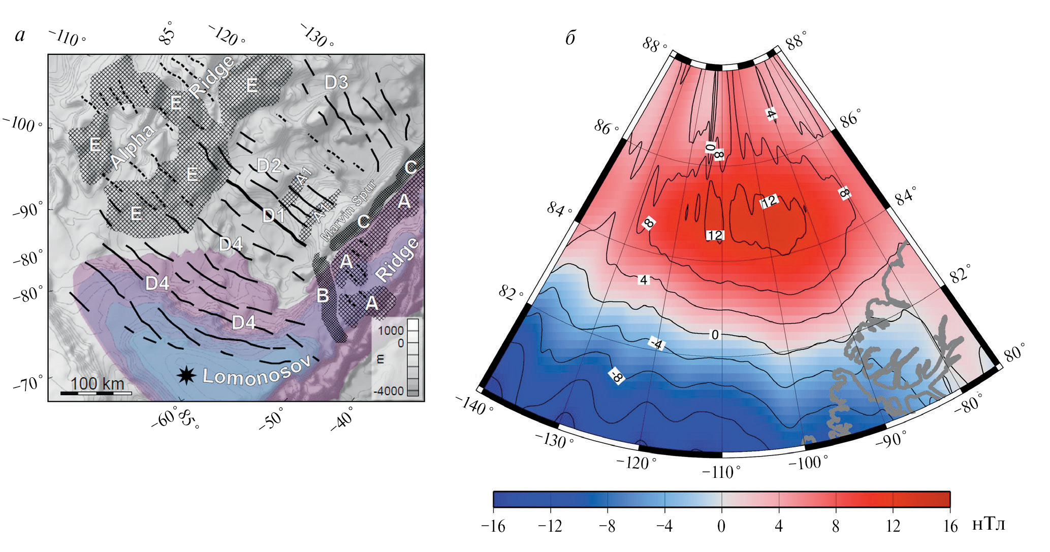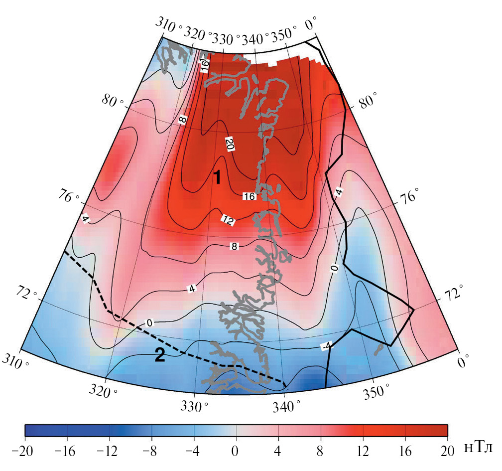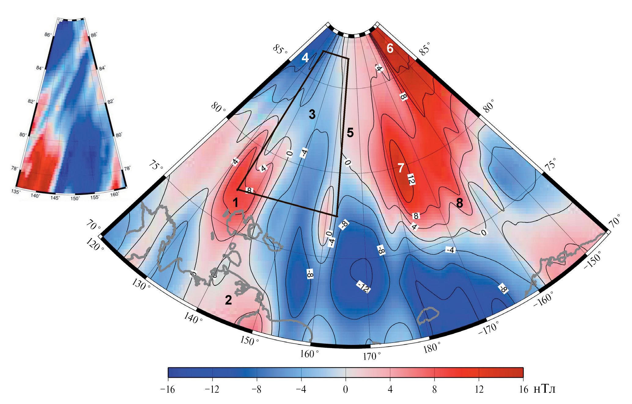 Полученная по спутниковым данным литосферная магнитная аномалия, топографически приуроченная к этой структуре, точнее, к части хребта Ломоносова , находящейся в восточном полушарии, состоит из нескольких сегментов разного знака и различной интенсивности (на рис. 4 обозначены цифрами 1, 2, 3).