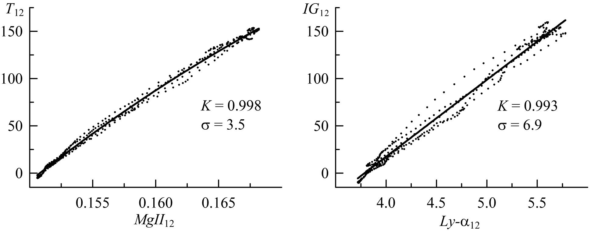 Рис. 1. Зависимости ионосферных индексов T12 и IG12 от солнечных индексов активности MgII12 и Ly-α12 по данным измерений и уравнениям регрессии (4) – точки и сплошные линии; K и σ – коэффициенты корреляции и стандартные отклонения этих уравнений.