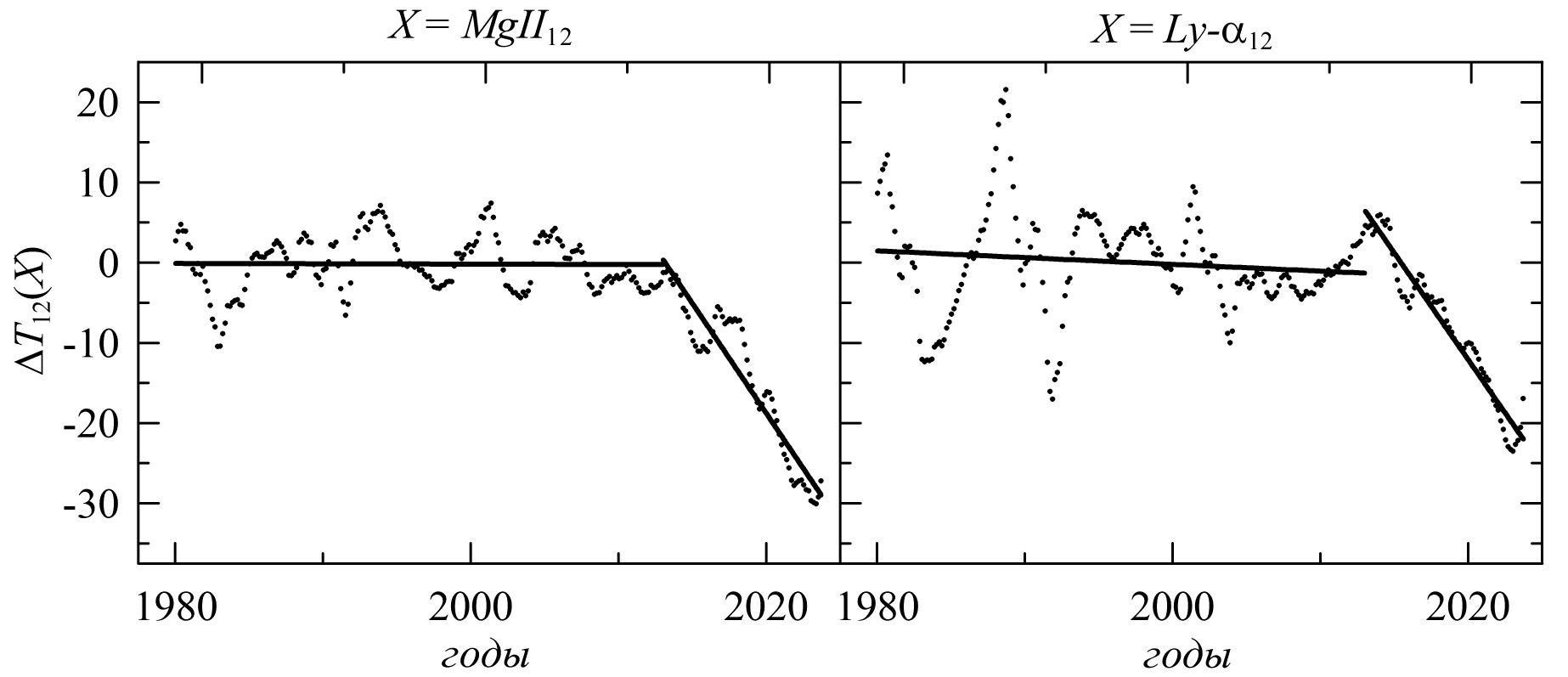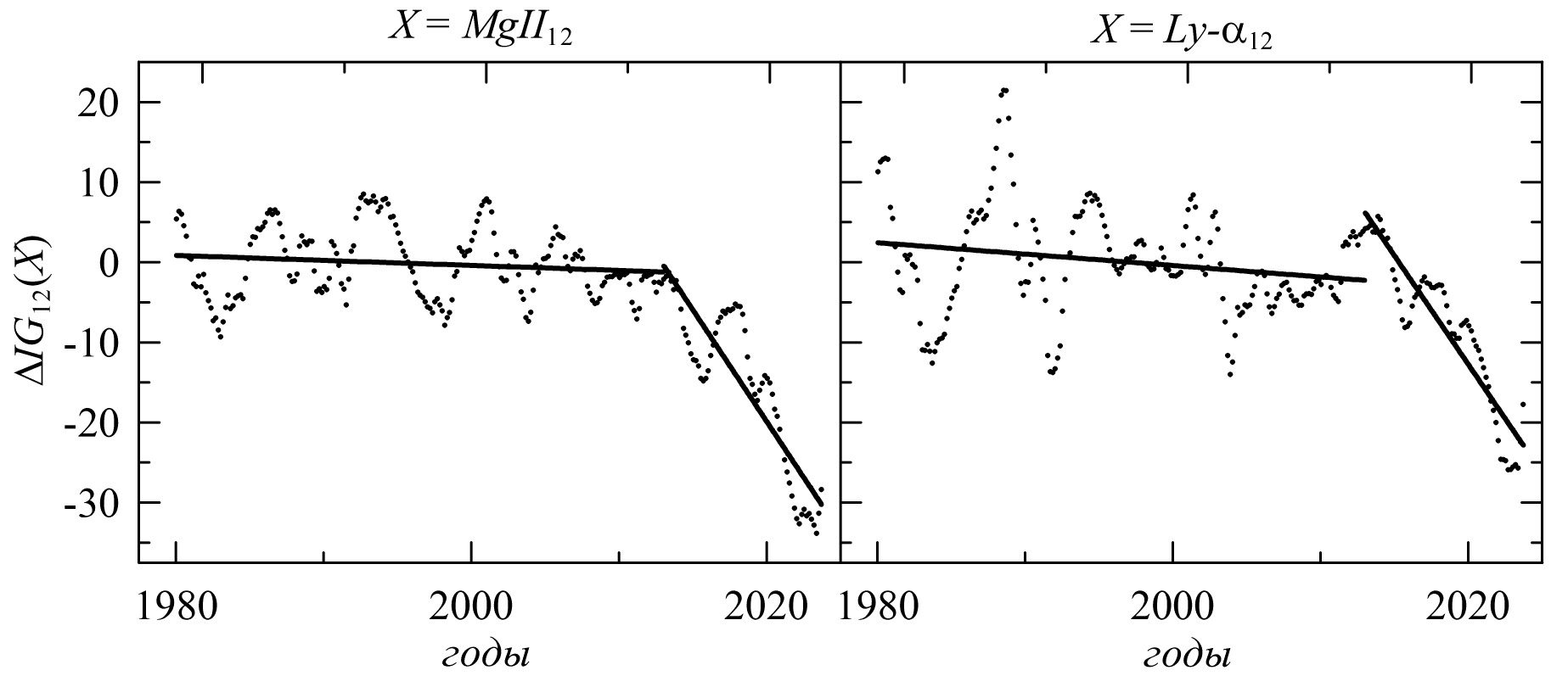 Более наглядно о характере изменений ∆Y(X) со временем можно судить по данным на рис. 2 и рис. 3. Из данных на этих рисунках можно видеть, что разброс данных относительно линейных трендов действительно большой. Этот разброс особенно большой для ∆Y(Ly-α12), включая интервал 1989–1991, когда прямые измерения Ly-α отсутствовали и были заполнены данными MgII на основе уравнения регрессии между Ly-α и MgII [Machol et al., 2019]. Относительно большие значения стандартных отклонений σ для ∆Y(Ly-α12) в интервале 1980–2012 связаны с этой же причиной (см. таблицу 2). Отметим, что на рисунках 2 и 3 не видно особенно сильных флуктуаций ∆Y(MgII12) для интервала 1989–1991, в котором MgII использовался для заполнения отсутствующих данных Ly-α.