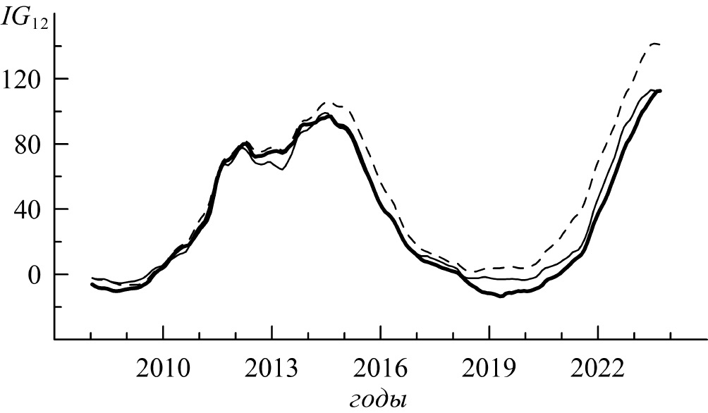 Рис. 4. Изменения со временем в годах индекса IG12 (толстая линия) и моделей этого индекса IGmod(F1012) – тонкая линия и IGmod(MgII12) – штриховая линия.