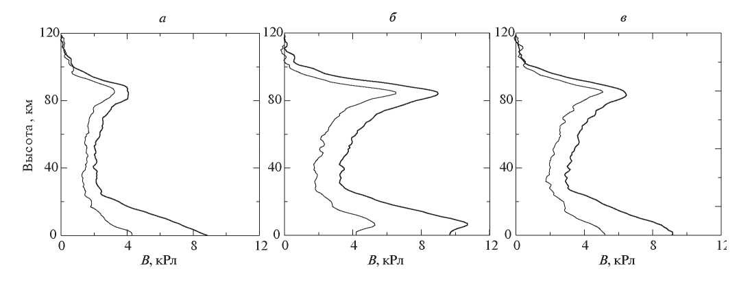 Рис. 4. Усредненные вертикальные профили яркости атмосферы. Толстой линией обозначены вертикальные профили яркости атмосферы в интервале длин волн 700 ± 5 нм, тонкой – в интервале 830 ± 5 нм. Профили яркости построены по снимкам, сделанным 07.03.2023 г. в моменты времени: 10:43:46 UTC (а), 13:49:26 UTC (б), 15:22:26 UTC (в).