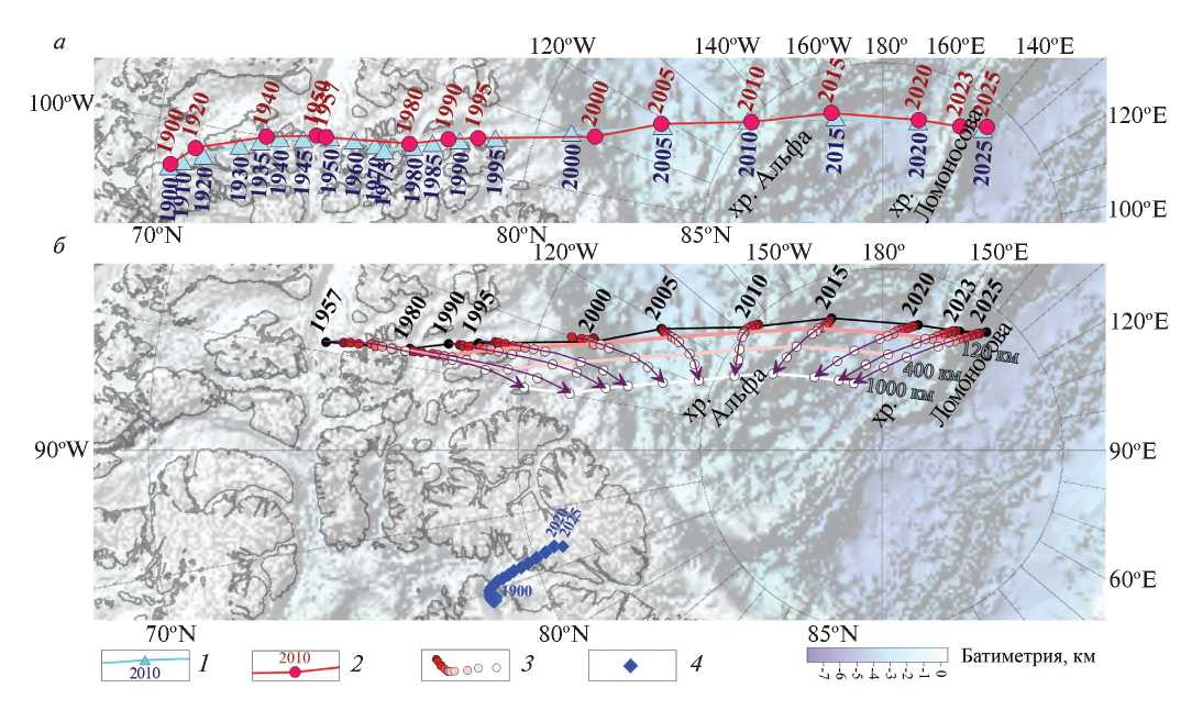 Рис. 1. Продвижение МП за период с 1900 по 2025 гг. (а) – Положение МП на земной поверхности; (б) – нулевая изолиния H-компоненты постоянного МПЗ на высотах до 1000 км. 1 – Положение МП по модели IGRF 13 (1900-2025 гг.); 2 – положение МП по H-компоненте магнитного поля авроральной зоны для высоты 0 км; 3 – эволюция положения МП с 1957 по 2025 гг. на высотах от 0 до 1000 км (модель СПбФ ИЗМИРАН); 4 – геомагнитный полюс 1900–2025 гг.