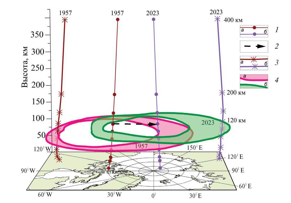 МП перемещается по траектории нулевой изолинии H-компоненты. С 1900 по 2023 гг. в Арктике МП продвинулся по земной поверхности на 2500 км. Расчеты H-компоненты до 1000 км показали, что с высотой длина траектории МП укорачивается (рис. 1). Если на поверхности Земли за период с 1957 по 2023 гг. она составила 1900 км, то на высоте 120 км – 1700 км, на высоте 200 км – 1600 км, на высоте 400 км – 1400 км и на высоте 1000 км – 1000 км (рис. 2).