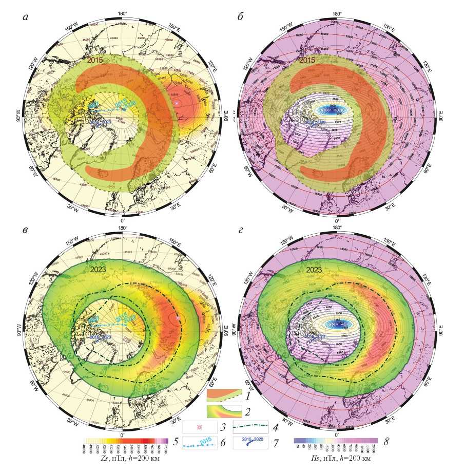 Рис. 5. Положение овала полярного сияния в периоды разной геомагнитной активности. (а, б) – Z- и H-компоненты МПЗ 2015 г.; (в, г) – Z и H 2023 г. Овалы в возмущенный день: 1 – 17.03.2015 (Kp = 9); 2 – 23.03.2023 (Kp = 7); 3 – зона максимумов Z; 4 – Z авроральной зоны (высота 200 км); 5 – овал в спокойный день 17.01.2023 (Kp = 3); 6 – перемещение МП с 1957 по 2023 гг. (высота 200 км); 7 – перемещение геомагнитного полюса 1900–2025 гг.; 8 –H-авроральной зоны (высота 200 км).