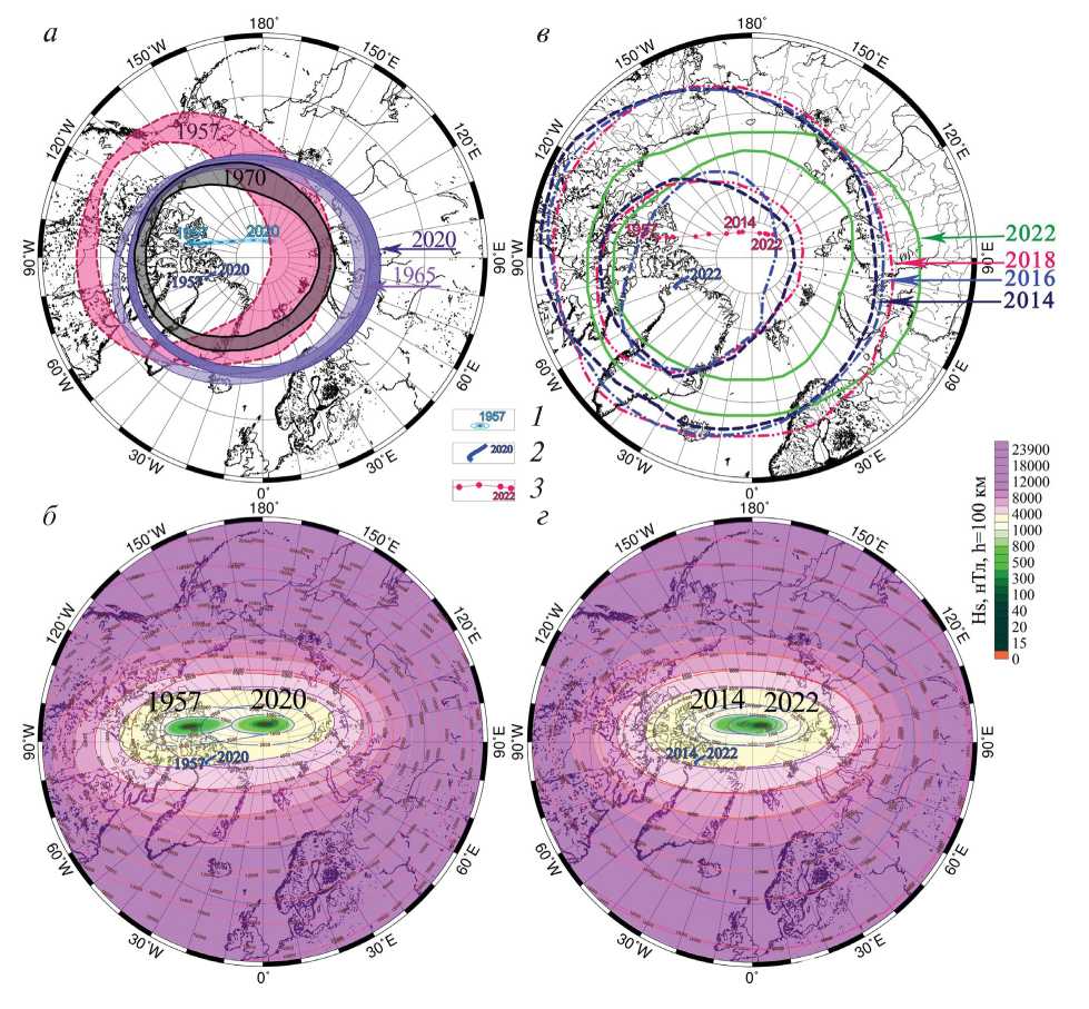 Рис. 6. Авроральная зона северного полушария: (а) – северный авроральный овал в зимние периоды разных лет: овал 1957 г., овал 1970 г, модельные овалы 1965 и 2020 гг., (в) – границы северных авроральных овалов по текущим прогнозам модели OVATION в магнитоспокойные дни 2014, 2016, 2018, 2020 гг. Эволюция H-компоненты магнитного поля авроральной зоны (высота 100 км): (б) – за период с 1957 по 2020 гг., (г) – за период с 2014 по 2022 гг. 1 – перемещение H-компоненты с 1957 по 2023 г. на высоте 100 км; 2 – перемещение геомагнитного полюса (1900-2023 гг.); 3 – перемещение МП на приземной высоте (1957 по 2023 г.).
