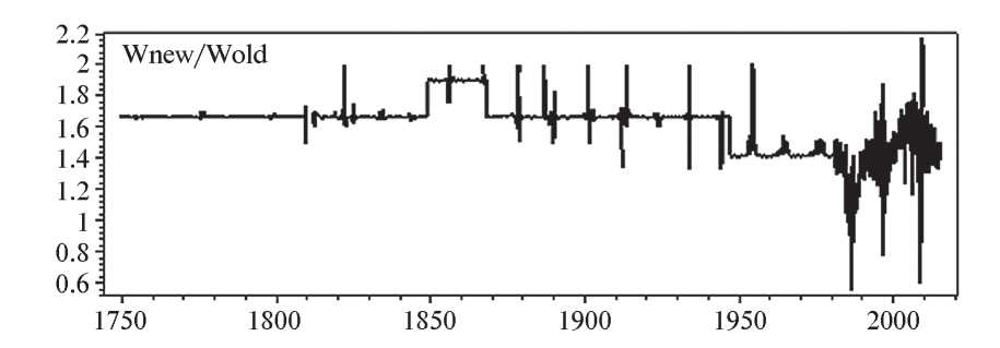 Рис. 1. Обзор отношения показаний новой и старой версий ряда WSN, ось ОХ — дата.