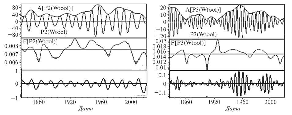 Применяя процедуры (1) к рядам Р2(Wtool) и Р3(Wtool), мы переходим к соответствующим медленно меняющимся огибающим (амплитудам) A[Р2], A[Р3] и “мгновенным” частотам в обратных месяцах F[Р2], F[Р3], обзор которых представлен на рис. 3. (слева- результаты для Р2(Wtool), справа – для Р3(Wtool), ось Х – дата).