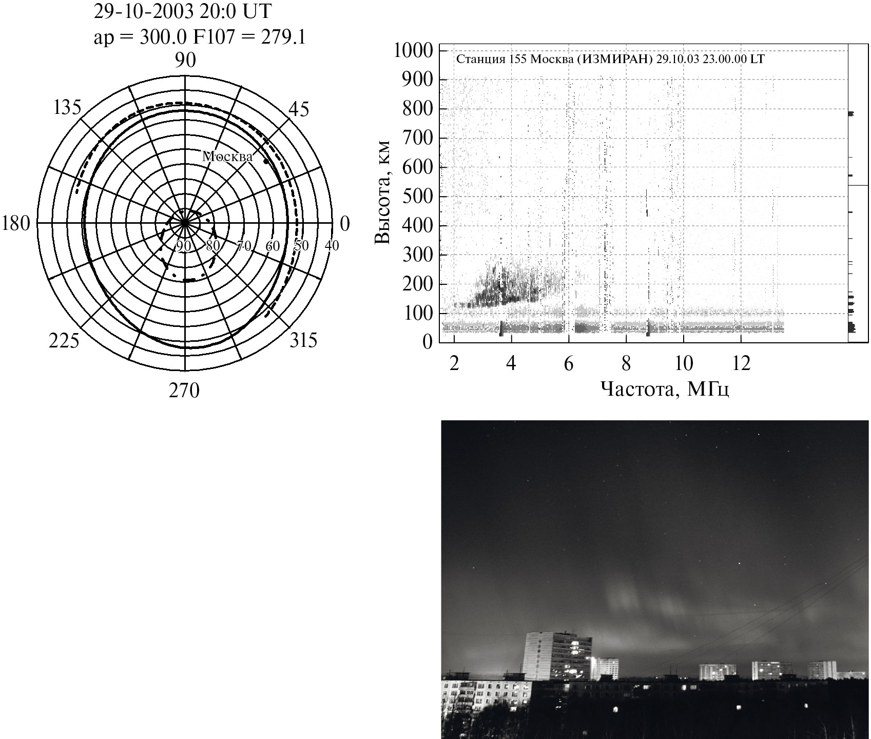 На рис. 1 представлены результаты применения модели GDMI во время экстремально сильной геомагнитной бури 29–31 октября 2003 г. [Веселовский и др., 2004] по данным ионосферной станции ИЗМИРАН 29.10.2003 20:00 UT [Боярчук и др., 2005]. Сплошной линией на левой панели рис. 1 отображено положение экваториальной границы аврорального овала из чего следует, что ст. Москва (ИЗМИРАН) находится внутри области высыпания заряженных частиц солнечного ветра (аврорального овала). Это подтверждается фотографией полярного сияния в проекции восток-запад, на которой хорошо видно направление геомагнитного поля с юга на север, по которому движутся ионизирующие атмосферу частицы (нижняя правая панель на рис. 1). Процесс генерации аврорального слоя E в ночных условиях с очень высокой критической частотой 6 МГц зафиксировал ионозонд “Парус” (правая верхняя панель на рис. 1). Отчетливо виден выраженный основной, аналогичный классическому случаю с частотной зависимостью след с начальной действующей высотой ~ 120 км и сложная диффузная область отражений с большим запаздыванием, которая формируется, по-видимому, как отражениями от локальных неоднородностей (турбулентности) электронной концентрации в слое, так и из-за большой толщины самого слоя.