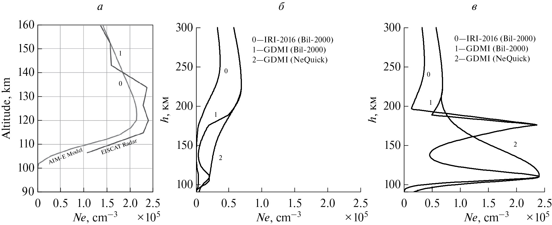 Рис. 2. Вертикальные профили концентрации электронов 05 декабря 2007 г. 00:36:36 UT: (а) модель AIM-E – кривая 0, данные радара некогерентного рассеяния EISCAT UHF – кривая 1; (б) – вертикальные профили концентрации электронов, рассчитанные по моделям IRI-2016 – кривая 0, GDMI с профилем [Bilitza et al., 2000] – кривая 1 и GDMI с профилем NeQuick– кривая 2; (в) – вертикальные профили моделей IRI-2016, GDMI и NeQuick электронной концентрации с NmE, соответствующей данным радара в Тромсё.