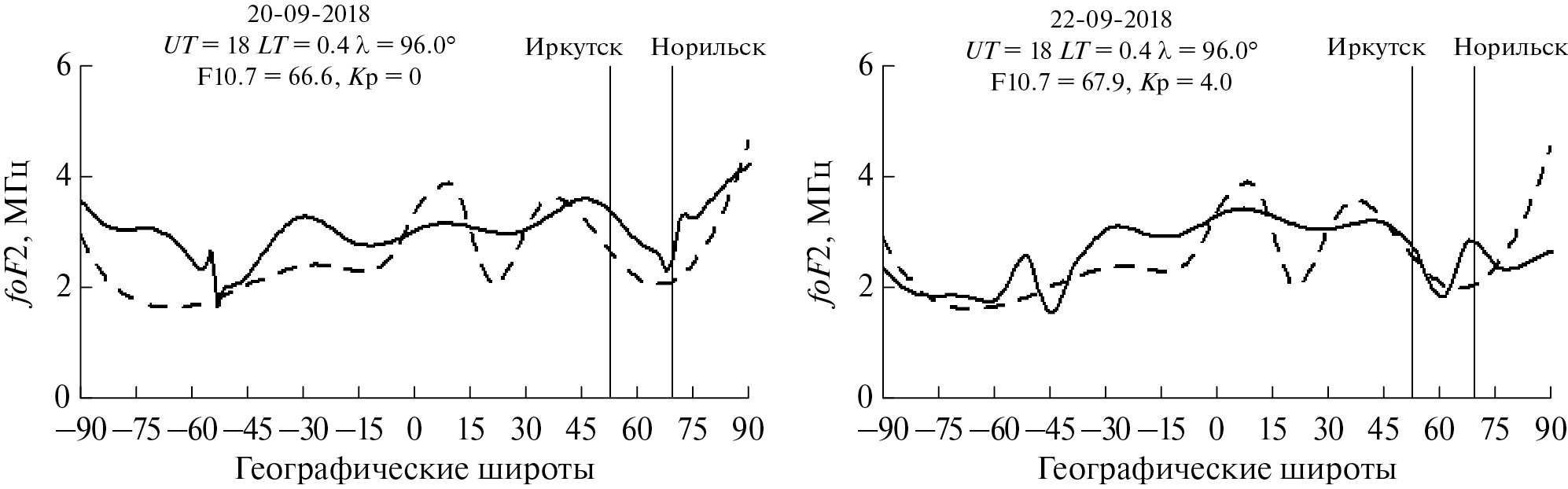 Как видно из рис. 4, где представлены широтные зависимости критической частоты foF2 для долготы средней точки радиотрассы, в спокойных условиях 20.09.2018 главный ионосферный провал в модели GDMI находится на широте Норильска (левая панель рис. 4), а в геомагнитно-возмущенный день 22.09.2018 смещается на более низкие широты (правая панель рис. 4). Соответственно смещается и полярный овал, в котором и формируется авроральный E-слой. Для сентября 2018 г., года низкой солнечной активности, сглаженные среднемесячные значения числа солнечных пятен Rms = 6.5 и поток радиоизлучения Fms = 70. Рассчитанные значения среднемесячной МПЧ 1F2 представлены кривой 0, а в реализации для гелиогеофизических условий конкретных дней кривой 1 на рис. 3. Хорошо заметен рост дневных значений МПЧ 1F2 в магнитоспокойный интервал с 19.09 по 21.09 как в эксперименте, так и в расчетных значениях по модели GDMI, а также существенное расхождение среднемесячных и посуточных результатов, особенно в локальное полуденное время. Рассчитанные с учетом текущих гелиогеофизических условий МПЧ 1F2 значительно лучше соответствуют экспериментальным данным в целом, а суточная динамика отражает инерционные свойства ионосферы. Однако в ночных условиях наблюдается некоторое расхождение расчетных и экспериментальных значений МПЧ 1F2.Экспериментальные результаты ниже модельных оценок и ближе к среднемесячным данным моделирования.