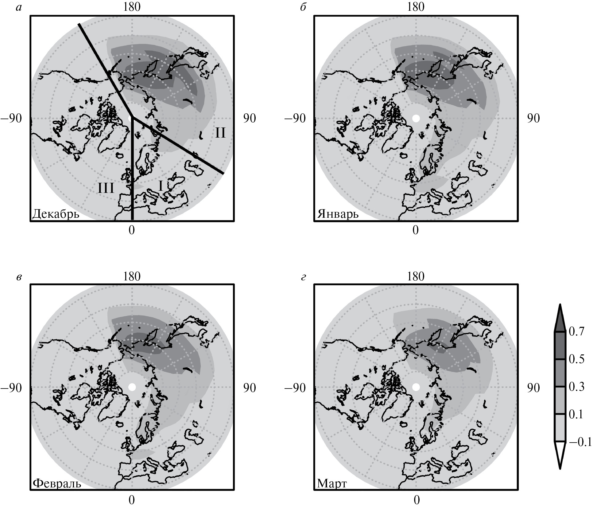Полученное усреднение позволило определить области разделения территории Северного полушария на широтно-долготные сектора для дальнейшего исследования межгодовой изменчивости вертикальной составляющей потока, построения и оценки линейного тренда. Выбранные сектора представлены на рис. 1а. К первому сектору (I) относится большая часть Европы, север Африки, европейская часть России и Ближний Восток, ко второму (II) – азиатская часть России и страны Азии (где наблюдается максимум восходящего потока волновой активности), к третьему (III) – Канада, Гренландия, США и Северная Атлантика (где наблюдается максимум нисходящего потока волновой активности).