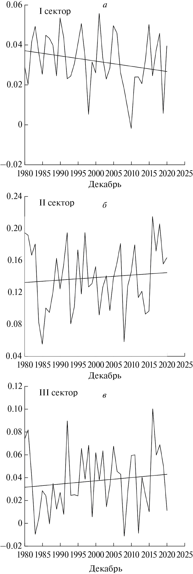 Результаты расчета и усреднения по секторам вертикальной составляющей потока волновой активности с 1980 г. для декабря на рис. 4 показывают, что во II секторе также не наблюдается статистически значимого тренда, но и в III секторе линейный тренд не значим. Значимым становится тренд в I секторе (уровень значимости 10%), в котором наблюдается уменьшение потока волновой активности из тропосферы в стратосферу. Стоит отметить, что в декабре в III секторе наблюдается один из максимумов (для этого сектора) усредненного восходящего потока волновой активности в 2017 г., хотя в этой области нисходящие потоки наблюдаются чаще.