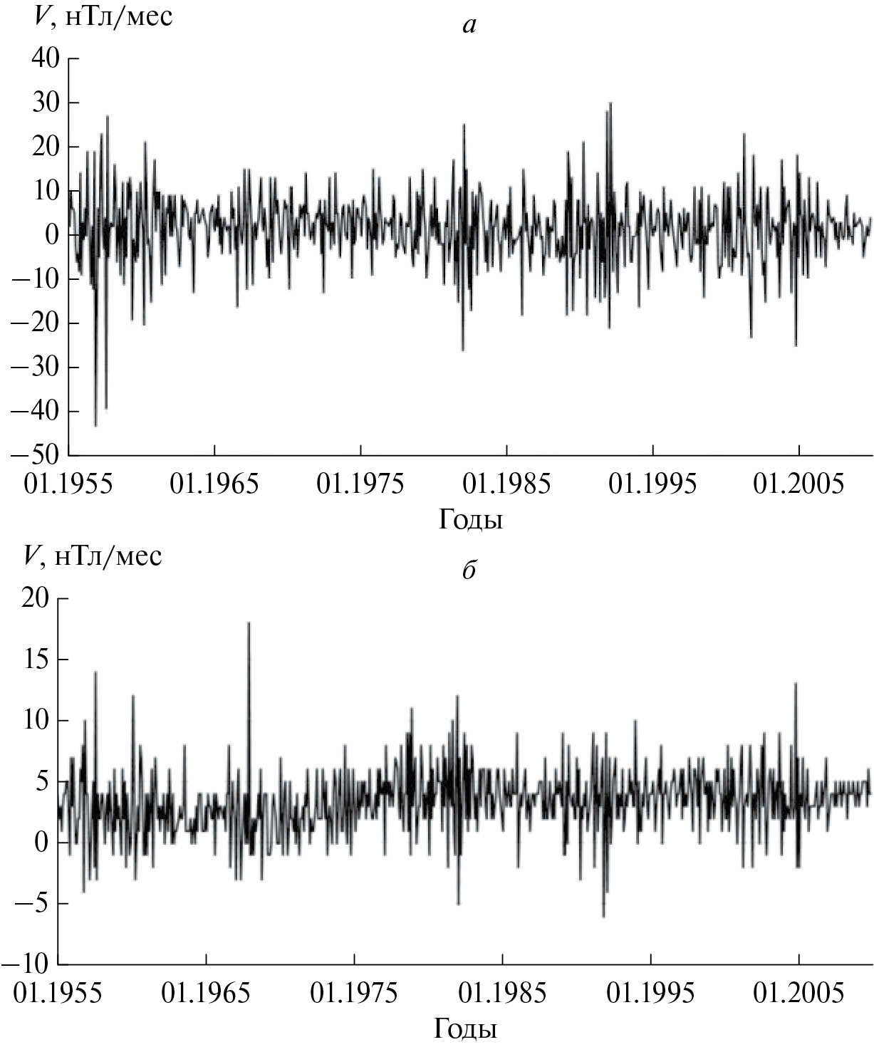 Среднемесячные значения компонент X, Y и Z определялись из среднесуточных значений, взятых из (http://www.wdc.bgs.ac.uk/catalog/master.html), как средние арифметические. В качестве погрешностей наблюденных данных была принята половина последнего измеренного разряда. Непосредственно анализу подвергались скорости изменения компонент. В связи с использованием среднемесячных данных за единицу дискрета по времени при расчетах был выбран месяц. Это позволило определять среднемесячные значения скорости, как разность соседних значений компонент, в частности, для X- компоненты: Xn − Xn−1. Аналогично для Y- и Z-компонент. В дальнейшем везде, где это не оговорено специально, анализируются скорости изменения компонент и их вейвлет-коэффициенты.