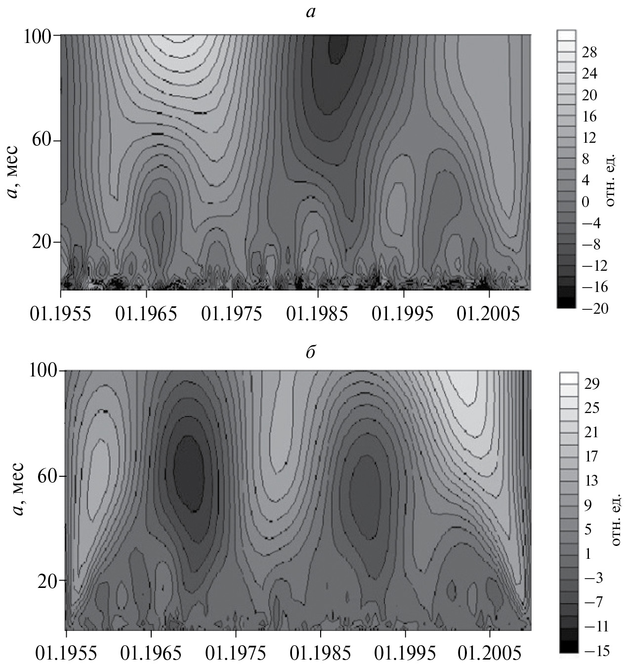 Рис. 2. Картины вейвлет-коэффициентов скоростей изменения (а) – X- и (б) – Y-компонент на обс. Chambon-la-Foret (CLF). По вертикальной оси даны значения масштабного коэффициента, по горизонтальной – соответствующие даты.