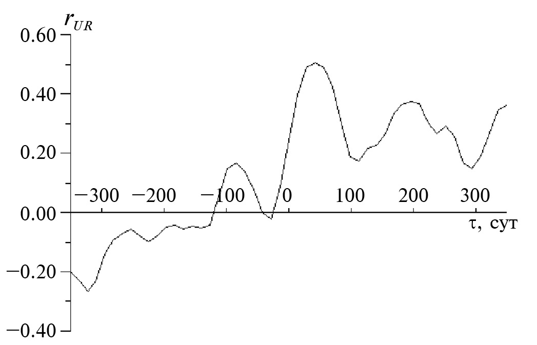 На рис. 4 результат представлен в терминах корреляционной функции. Главный максимум rUR = 0.51 ± 0.02 наблюдается при опережении τ = 42 сут, в согласии с результатом причинного анализа.