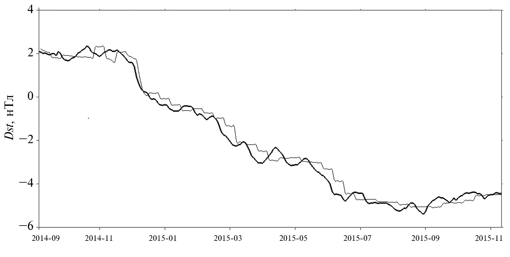 Рис. 14. Прогноз Dst методом текущей нейросети с фиксированной заблаговременностью 329 сут (тонкая линия) в сопоставлении с фактической кривой (жирная линия). Среднеквадратичная погрешность прогноза 0.29 нТл.