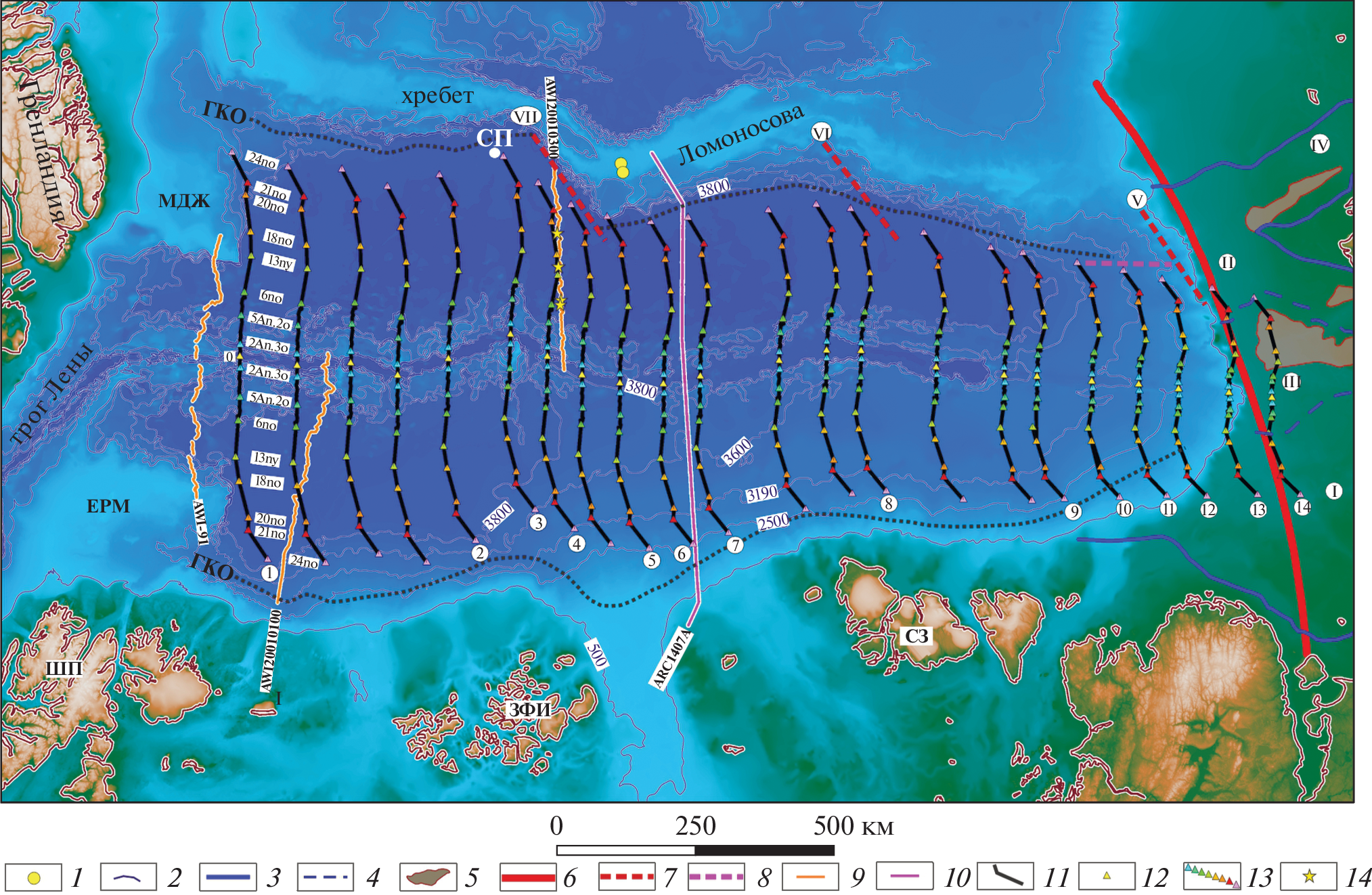 - Jokat W., Weigelt E., Kristoffersen Y. et al. New geophysical results from the south-western Eurasian Basin (Morris Jesup Rise, Gakkel Ridge, Yermak Plateau) and the Fram Strait // Geophys. J. Int. 1995. Vol. 123. P. 601–610.