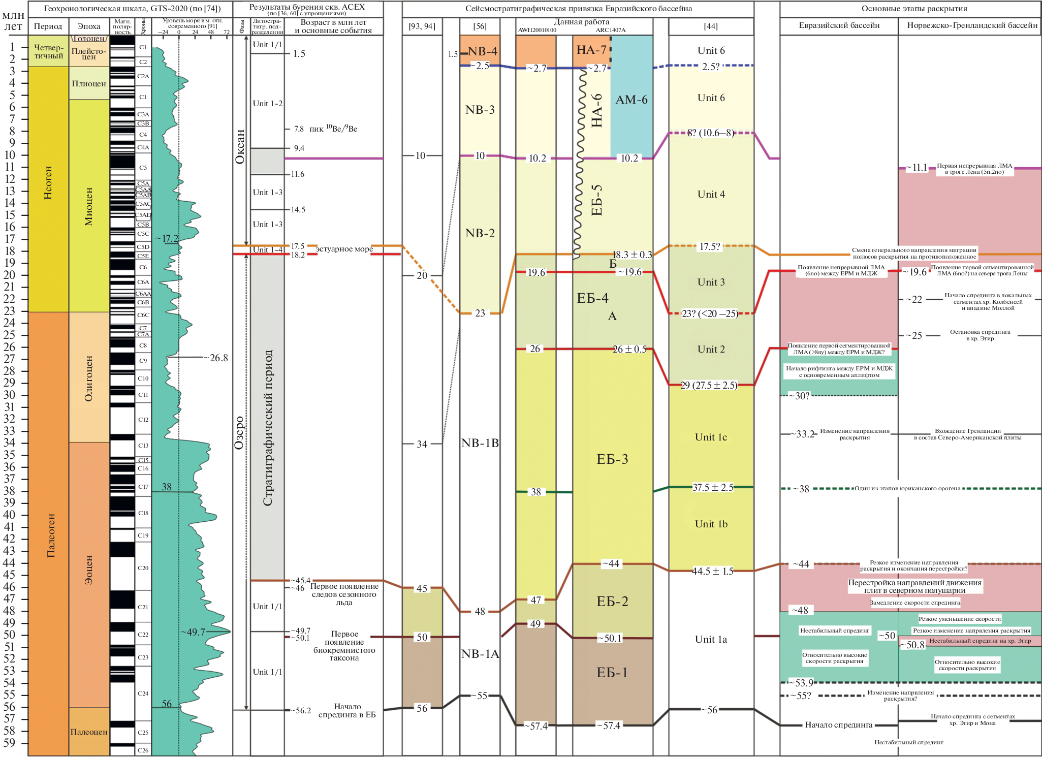 - Backman J., Jakobsson M., Frank M., Sangiorgi F., Brinkhuis H., Stickley C., O’Regan M., Lovlie R., Palike H., Spofforth D., Gattacecca J., Moran K., King J., Heil C. Age model and core-seismic integration for the Cenozoic ACEX sediments from the Lomonosov Ridge // Paleoceanography. 2008. Vol. 23. P. 1–15. https://doi.org/10.1029/2007PA001476