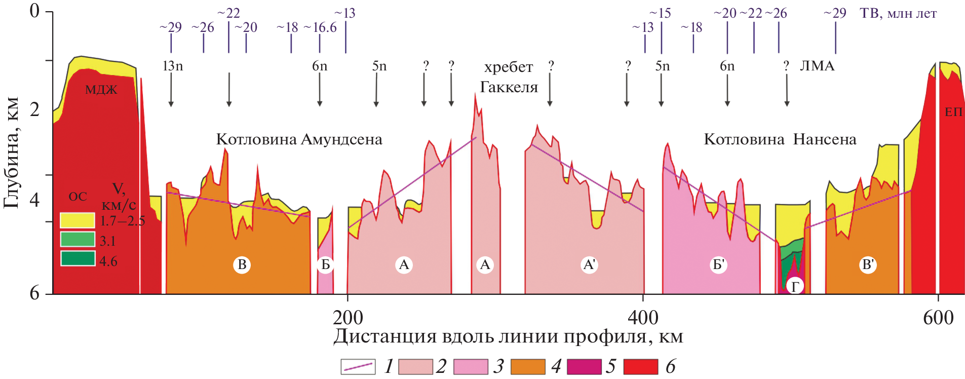 The work examined the tectonics and stratigraphy of the Eurasian basin in pre-Quaternary times based on the results of interpretation of the ARC1407A seismic profile and calculations of the theoretical position of linear magnetic anomalies. The sedimentary packages identified on the seismic profile and their stratigraphic adjustments are close to similar studies in the western parts of the Nansen and Amundsen basins. The age assignment of sedimentary strata corresponds to the results of drilling ACEX wells and the main stages of development of the Eurasian basin. The reference horizon of ~34 million years old, previously identified in some scientific works and associated with the cessation of spreading in the western part of the North Atlantic and the entry of the Greenland Plate into the North American Plate, has not been established, which is similar to studies in the western parts of the basins of the Eurasian Basin. For the western part of the Nansen Basin, a reference horizon with an age of ~38 Ma was identified for the first time, previously traced in the western part of the Amundsen Basin, the appearance of which is associated with one of the stages in the development of the Eurekan Orogeny. Also, for the western part of the Nansen Basin, within the ARC1407A section, a reference horizon with an age of ~26 Ma, previously traced in the western part of the Amundsen Basin, is established. The appearance of this boundary is associated with the beginning of unstable spreading in the westernmost segment of the Eurasian basin between the Yermak Plateau and the Morris Jesup Rise. The end of the long stratigraphic hiatus from 44.4 to 18.2 Ma in the ACEX well section clearly correlates with the appearance of sedimentary strata with an age of ~19.6‒18.3 Ma, which confirms the point of view about the beginning of the formation of the deep-sea connection between the North Atlantic and Eurasian basins. This event coincides with a fundamental stage in the restructuring of the movements of the Eurasian and North American plates, expressed in a change in the general direction of migration of the instantaneous opening poles from north-northwest to south-southeast. It is assumed that thick sedimentary deposits in the Nansen Basin and in the rift valley of the Gakkel ridge, observed on seismic section ARC1407A are glaciomarine Late Pliocene-Quaternary in age <2.7 Ma. Apparently these deposits are making up a significant volume of sediment in the eastern part of the Eurasian Basin and the Gakkel Ridge.