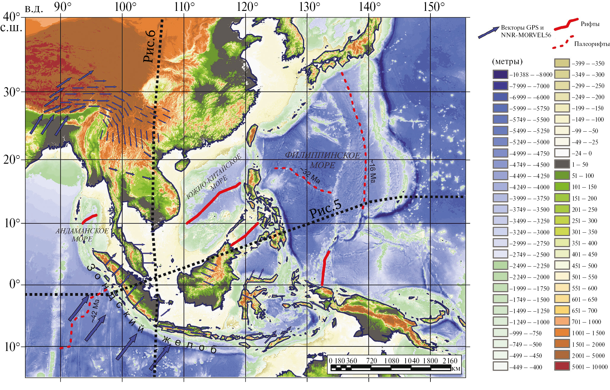 Схема построена: для континентальной части Китая и Индии — по данным GPS на основании работ [34, 38]; для Индонезии — по данным GPS [33]; схема движения Австралийской плиты — по данным модели NNR-MORVEL56 [18].