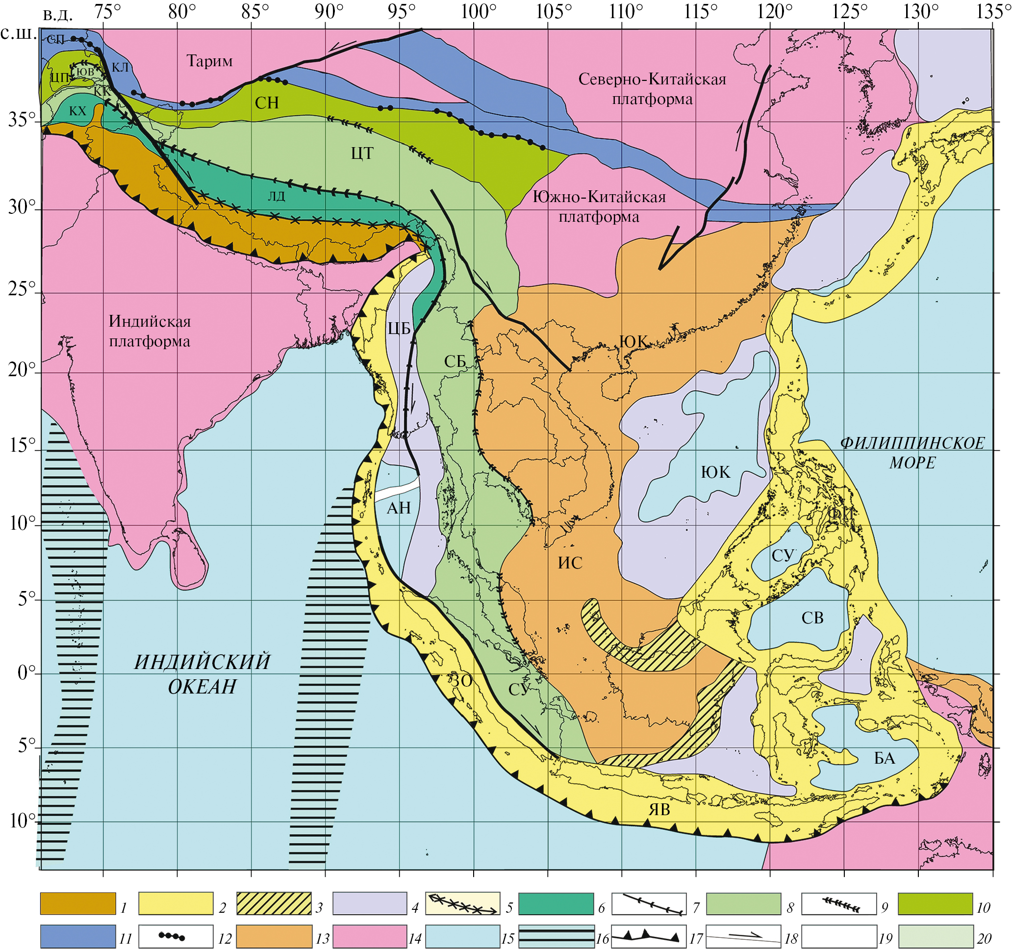 Новейшие островные дуги: ЗО — Зондская, ФИ — Филиппинская, ЯВ — Яванская; моря: АН — Андаманское, БА — Банда, СВ — Сулавеси, СУ — Сулу, ЮК — Южно-Китайское; прогиб: ЦБ — Центрально-Бирманский; зона: Иц — Инда-Цангпо; северная активная окраина Неотетиса: КХ — Кохистан, ЛД — Ладакх; южная пассивная окраина раннего Мезотетиса: КК — Северный Каракорум, ЮВ — Нуристан и Юго-Восточный Памир, ЦТ — Цянтан, СБ–Синобирманский массив, СУ — Северо-Восточная Суматра; северная окраина раннего Мезотетиса: ЦП — Центральный и Юго-Западный Памир, СН — Сунпань; поздние герциниды: СП — Северный Памир, КЛ — Куньлунь; палеозоиды: ЮК — Юго-Восточный Китай, ИС — Индосинийский массив; 1 — новейшее поднятие Гималаев; 2 — новейшие островные дуги (от основания дугового склона желоба до вулканической дуги включительно); 3 — островные дуги; 4 — новейшие задуговые бассейны (северное продолжение Андаманского моря, покрытое флювиальными осадками); 5 — сутура Неотетиса; 6 — северная активная окраина Неотетиса; 7 — зона сутур позднего Мезотетиса или задугового моря Неотетиса; 8 — южная пассивная окраина раннего Мезотетиса; 9 — зона сутур раннего Мезотетиса; 10 — северная окраина раннего Мезотетиса; 11 — сутуры позднего палеозоя; 12 — сутуры герцинского возраста; 13 — палеозоиды; 14 — докембрийские платформы и микроплиты с докембрийским фундаментом в палеозойских складчатых поясах; 15 — области с океанским типом земной коры; 16 — поднятия 70о и 90о в.д. в Индийском океане; 17 — крупнейшие новейшие надвиги и поддвиги во фронтальных частях островных дуг и Гималаев; 18 — крупнейшие новейшие сдвиги; 19 — рифтовые зоны в Андаманском море; 20 — границы тектонических провинций и зон