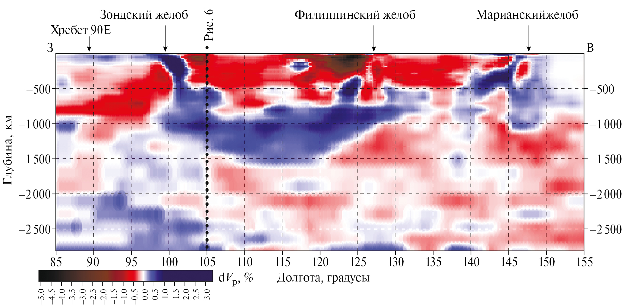 Вместе с тем, между Зондской и Марианской островными дугами выделяется обширная область высокоскоростной мантии на глубинах от ~700 до ~1500 км. Эту область можно рассматривать как объединение стагнирующих сегментов субдуцированных слэбов отдельных зон субдукции региона. Разрезы мантии показывают плоскую кровлю объединенного стагнирующего слэба и его расслоенное строение. Область стагнирующего слэба прерывается внедрением субширотных “горячих” объемов Южно-Китайского и в меньшей степени Андаманского морей.