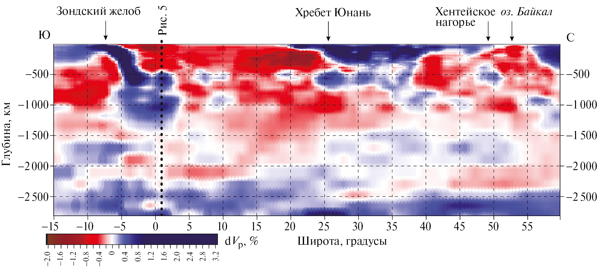 Как определено в работе [2], именно встречное движение Индийской плиты и Евразийского континента создает условие для формирования стагнирующих блоков и инициации ролл-бэк механизма [6], при котором функционирует отдельная, не связанная с остальной мантией, конвекция в диапазоне глубин <660 км и образуются задуговые рифтогенные структуры с неглубокими вторичными плюмами и вулканизмом. Эти задуговые структуры в поле сейсмотомографии представляют собой низкоскоростные “горячие” аномалии, нарушающие целостность “холодных” стагнирующих слэбов [5, 35].