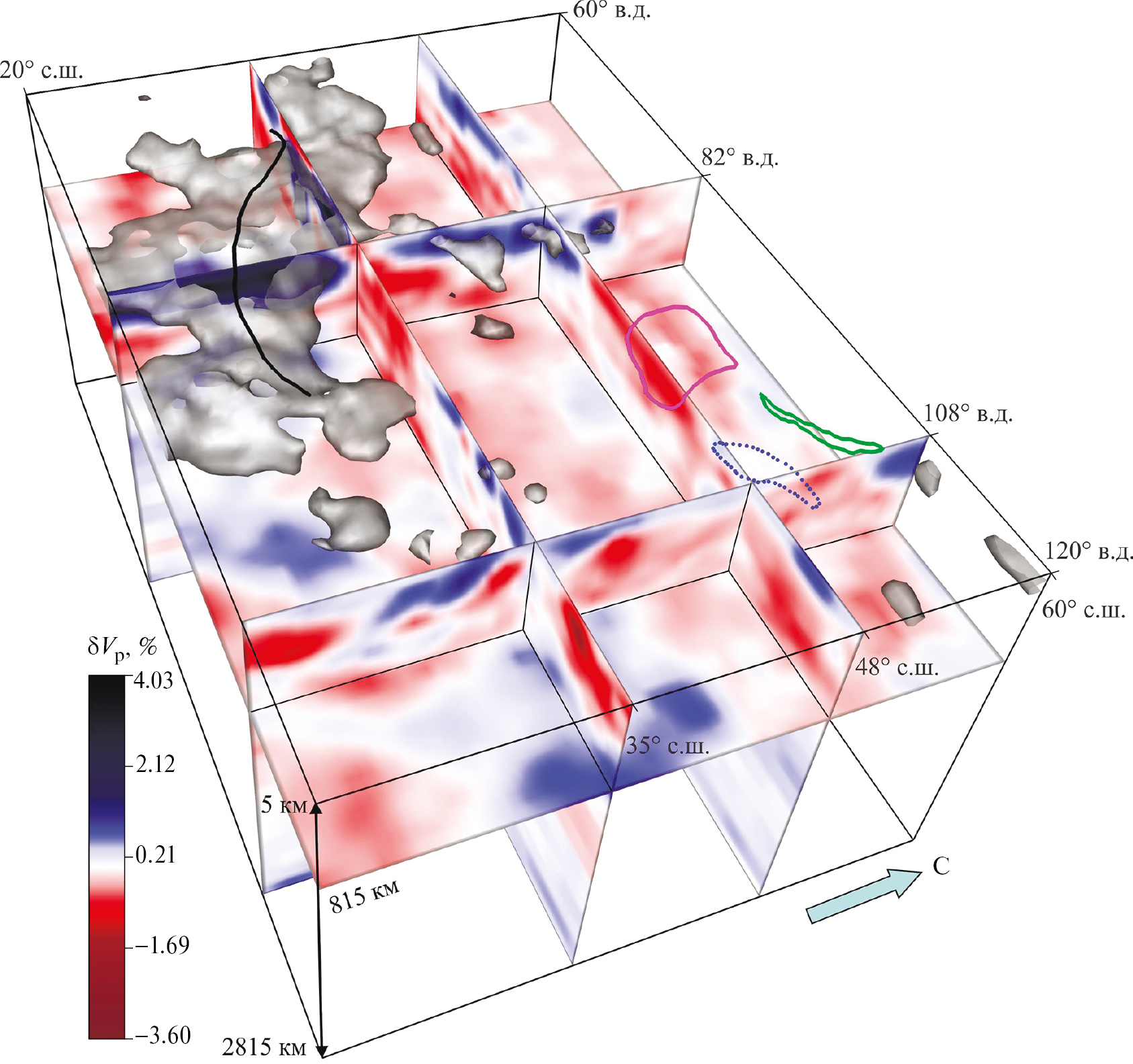 Рис. 4. Объемное распределение вариаций скоростей δVp в Юго-Восточной Азии по данным модели UU-P07 [17, 26, 36].