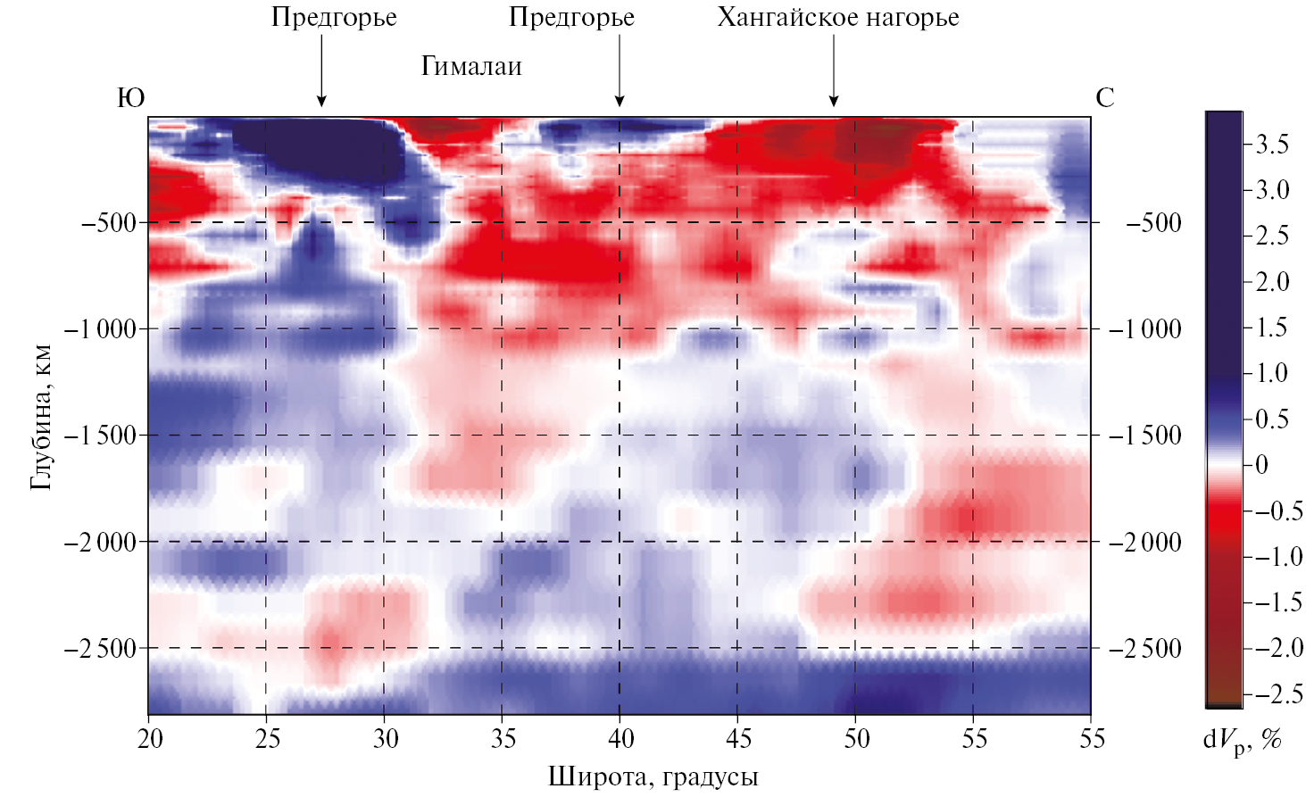 Рис. 6. Сейсмотомографический разрез вдоль субмеридионального профиля по данным модели UU-P07 (по [17, 26, 36]).